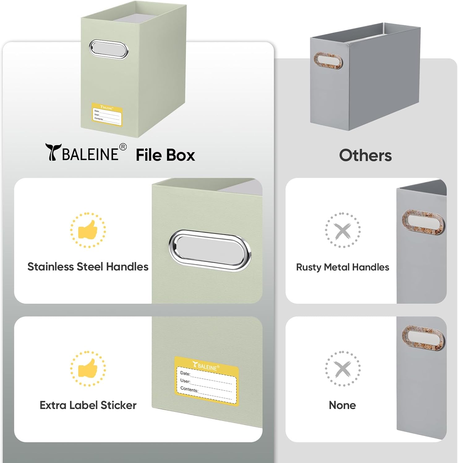 - UNIVERSAL SIZE: BALEINE File box with handles is suitable for letter size files; Designed for efficiency and functionality, itβs ideal for storing and organizing your paper documents, notebooks, and magazines (NOTE: Folders not included)