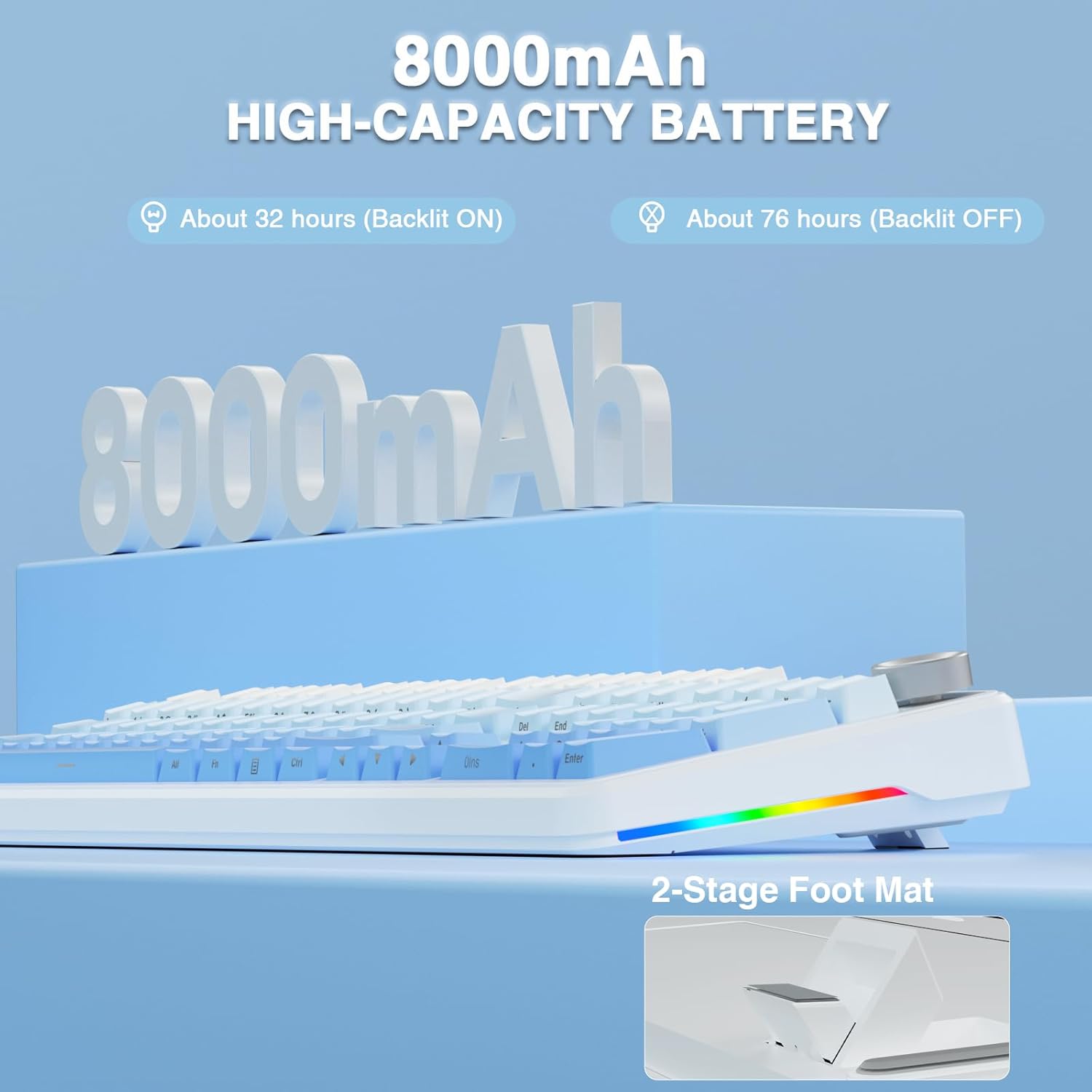 - 104 Keys Full Size Keyboard: The F108 Pro computer keyboard features a newly upgraded 100% full-size layout with arrow keys, function keys, and numeric zones for a more comfortable and productive office. The two-colour injection-moulded PBT keycaps are more durable without fading, sweat-proof, and softer to the touch. Built-in 8000mAh high-capacity battery, the creamy keyboard with number pad is suitable for long-time work or high-intensity gaming