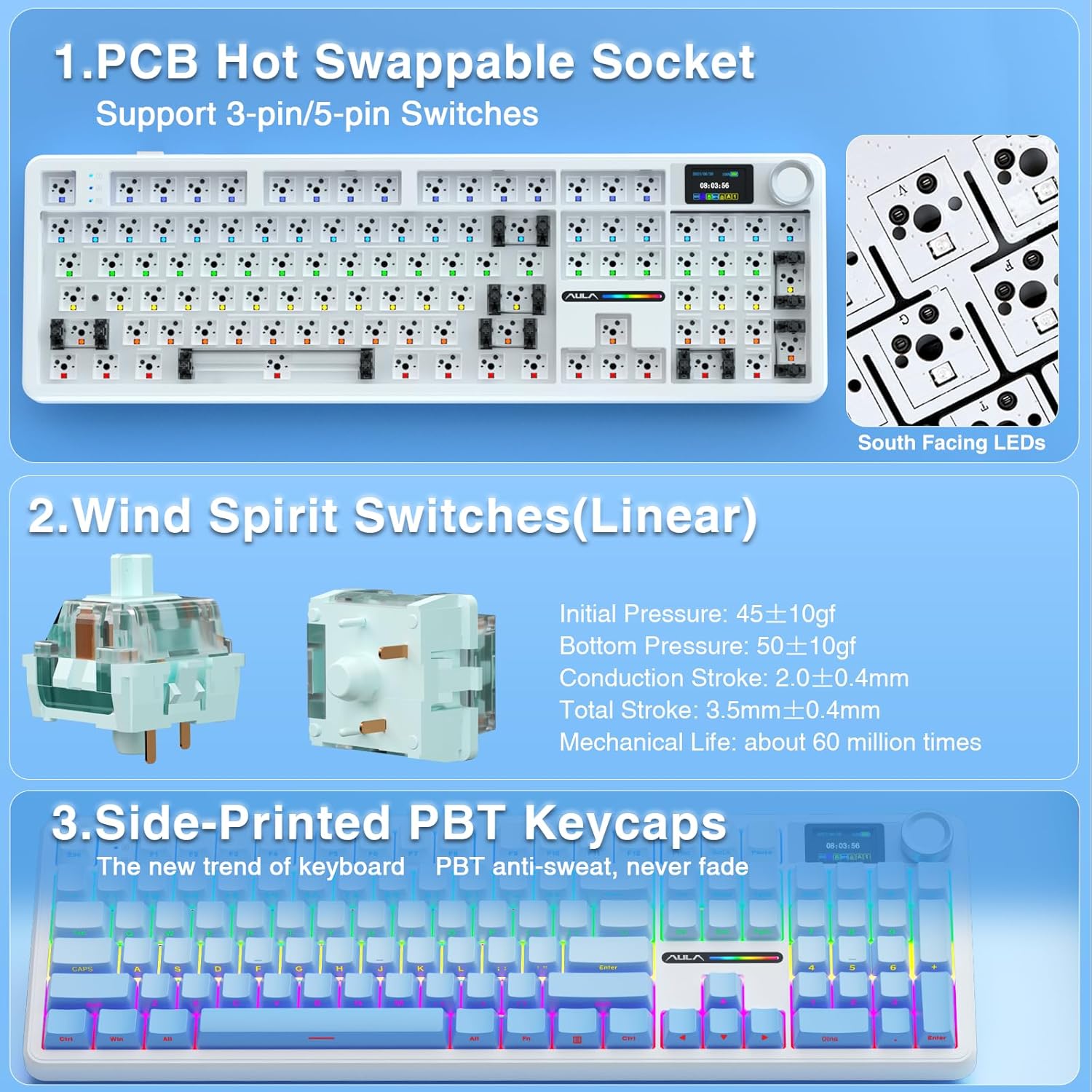 - Smart Display Screen & Multi-function Knob: AULA F108 Pro wireless mechanical keyboard has built-in intelligent TFT color display screen, which can be used as an interactive interface for real-time updating and customization. The high-definition display and multi-function knobs are designed to make it easy to switch and update custom Gif images, volume, date and time, battery status, backlight and connection modes for greater ease of use(Note: You need to download the software under windows system and keep in wired mode to set the screen image/GIF, calibrate the date and time. The screen has a transparent protective film that can be torn off for use)
