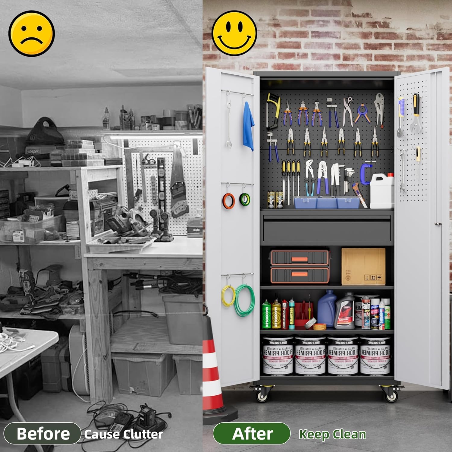 - 【1 Storage Drawer】Garage Tool storage cabinet with Wheels has 1 drawer in the cabinet to protect your private items. You can store important documents in it. The drawer is carried by two silent tracks, allowing for comfortable pulling.