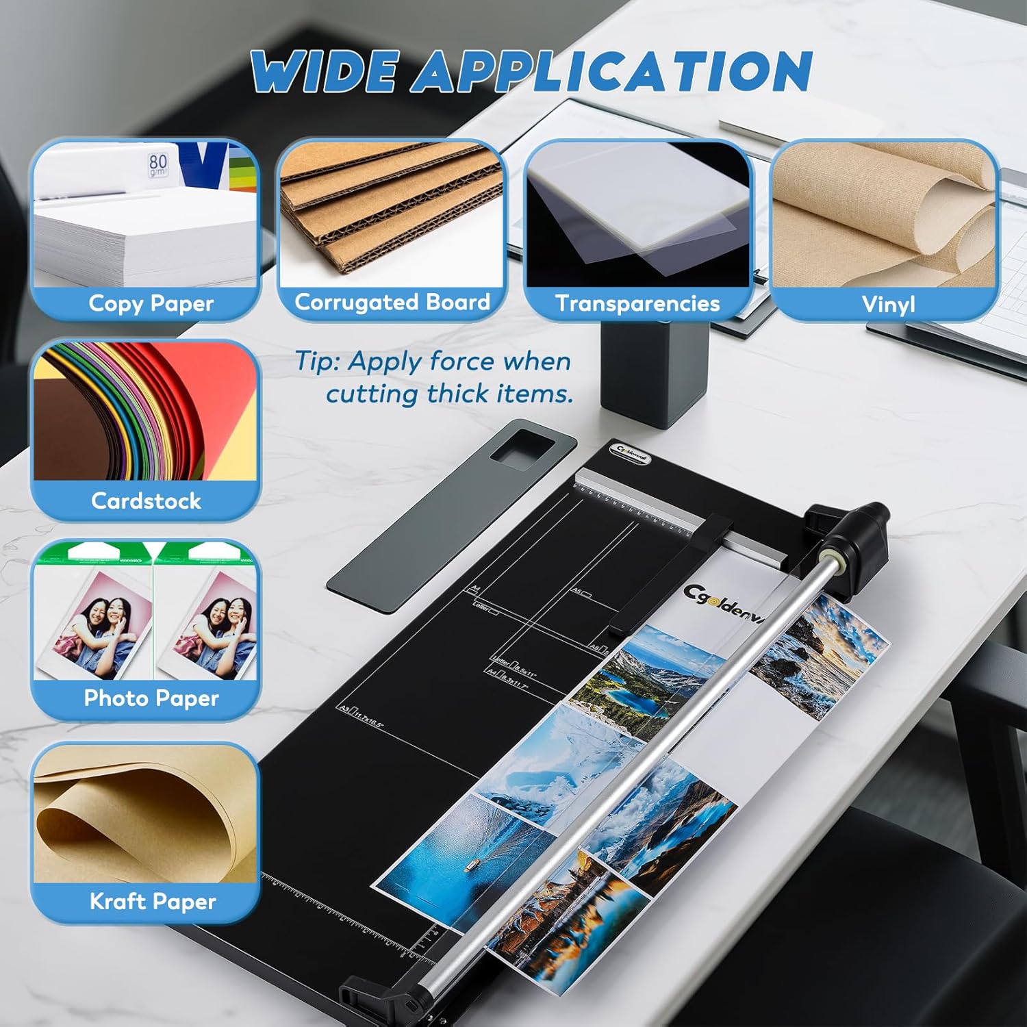 - 24.8" FOR VERSATILE USE: Tackle projects of any scale with 24.8" cutting length, compatible with A3, A4, 5×7" and custom paper sizes. Effortlessly handle copy paper, cardstock, photo paper, cardboard, and thin films, etc.—perfect for offices, home DIY crafts, schools, and photo studios.