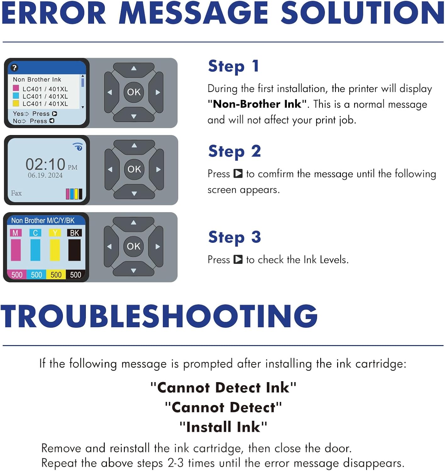 - Installation Tips: [1].Don't remove or touch the CHIP.[2]. When the printer prompts "non-original", please click OK or Next to continue. [3].When the printer appears "low ink", "empty", "replace ink cartridge" and other prompts, please remove the ink cartridge and reinstall it several times