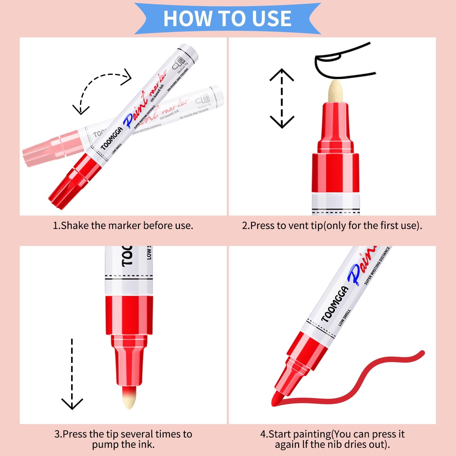 - Premium Quality: Each Red paint pens paint markers is independently tested, selected, and packaged in individual heat shrink film. Before use: Face tip upright,push against finger. Re-cap and shake. Press tip on surface several times