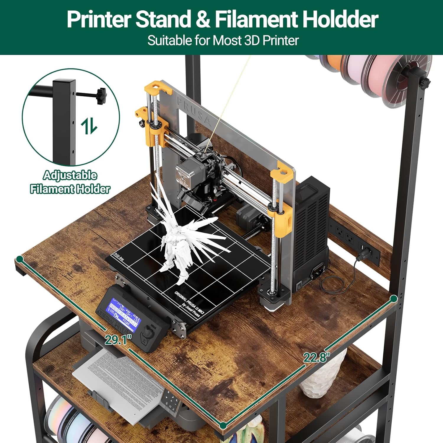 Homieasy Printer Stand with Charging Station, 29.1" x 22.8" Large 3D Printer Table with Filament Storage, Heavy Duty Rolling Printer Cart with 4-Tier Storage for Workshop/Office/Garage, Rustic Brown