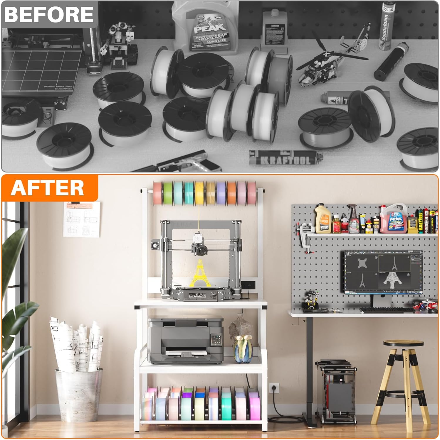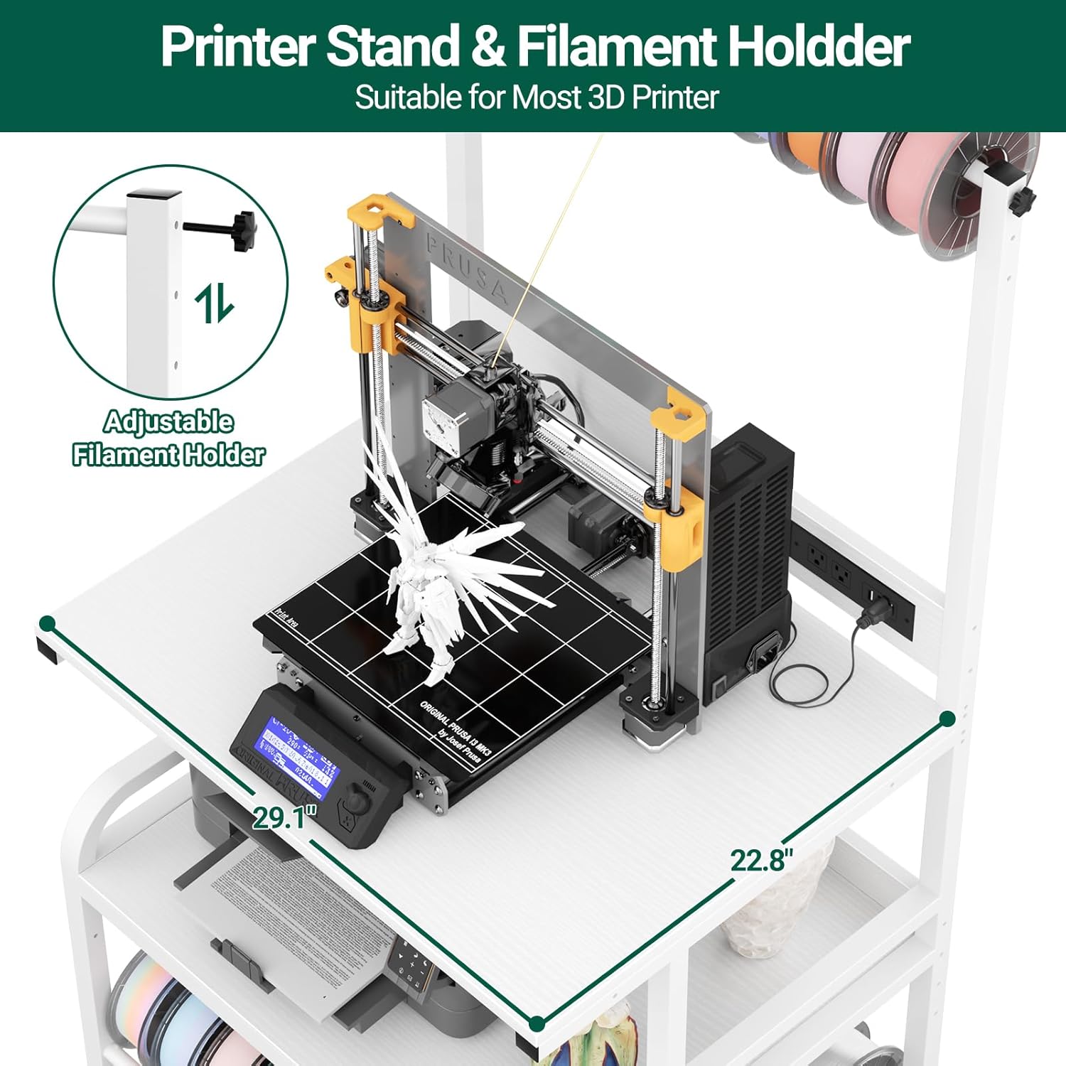 - High-Capacity Filament Storage Organizer: Measuring 29.1"L x 22.8"W x 60"H, this stand stores over 60 spools with an adjustable upper tube for quick access to 10 spools, reinforced lower shelves for bulk filament storage, and a versatile middle shelf that can be adjusted to hold small printers or creative 3D prints.