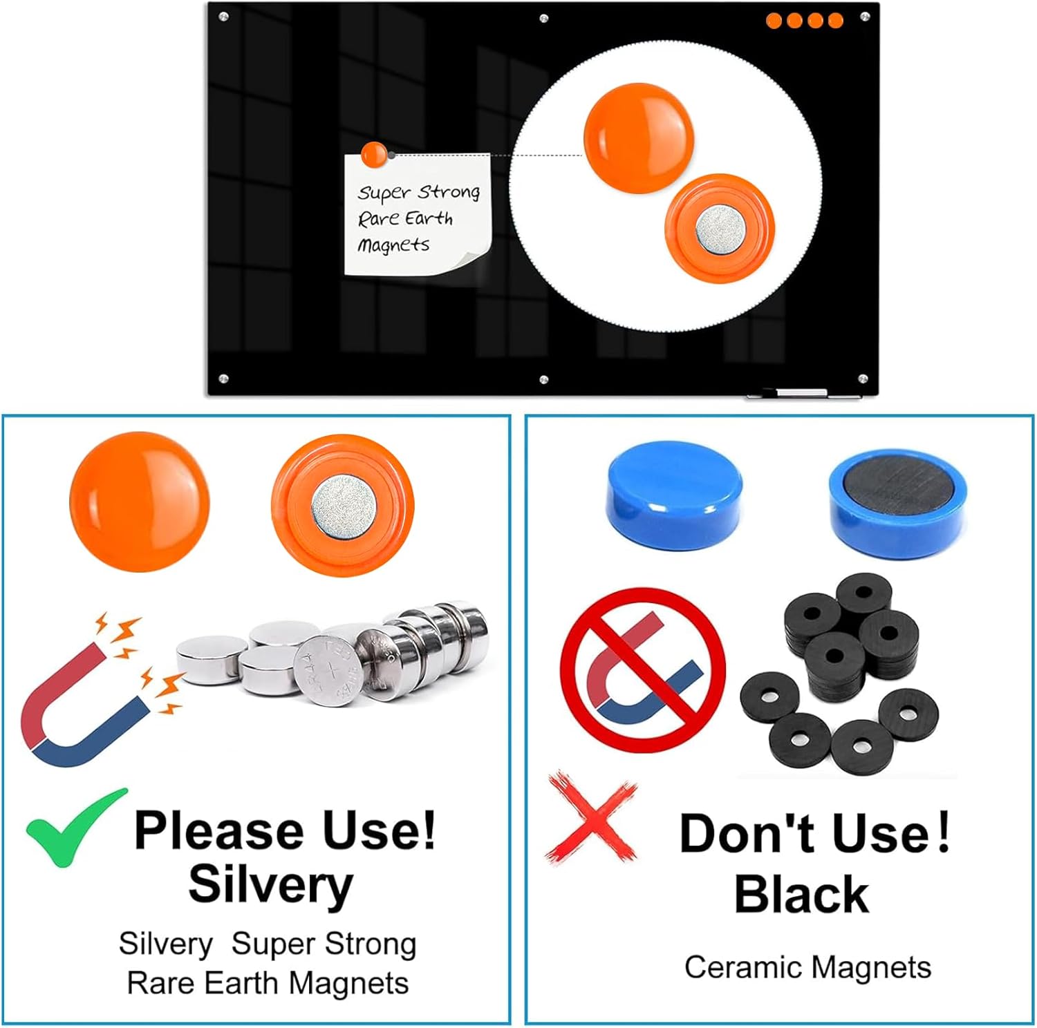 - COMPREHENSIVE ACCESSORIES SET: Comes with one 72" x 36" frameless tempered glass whiteboard, two markers, four magnets, one eraser and one marker tray for mounting. Pay special attention to the magnetism will not be strong due to the thickness of the glass, standard magnets do not work. Please use silvery super strong rare earth magnets. Don't use normal black magnet and fridge magnet.