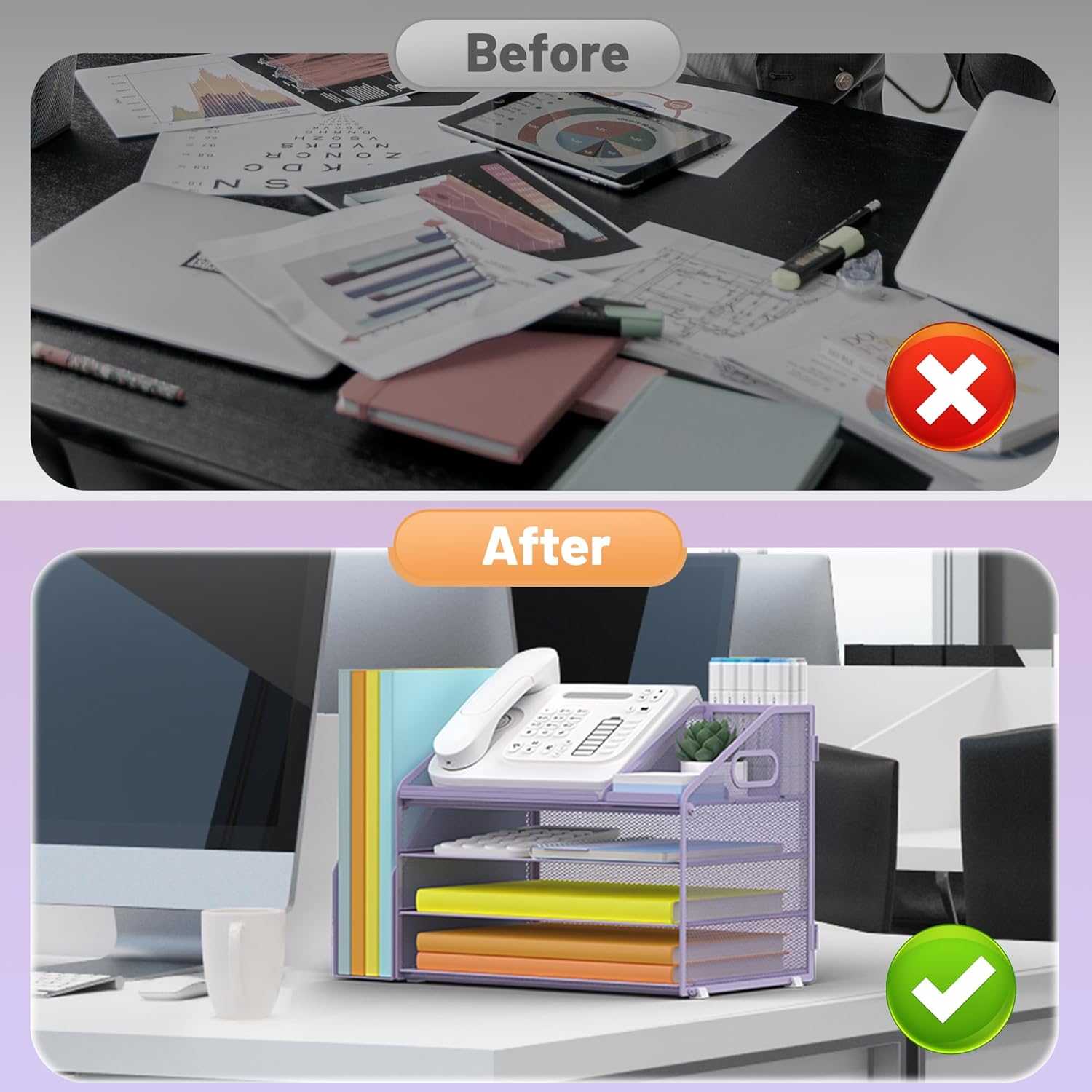 - 4 Tier Organization with Pen Holder: This Purple desk organizer boasts a 4-tier design for efficient sorting of your papers, letters, and other office supplies, along with a dedicated pen holder. It's perfect for maintaining a tidy and uncluttered workspace. The desk file organizer is an essential desk accessory that contributes to an orderly and professional atmosphere
