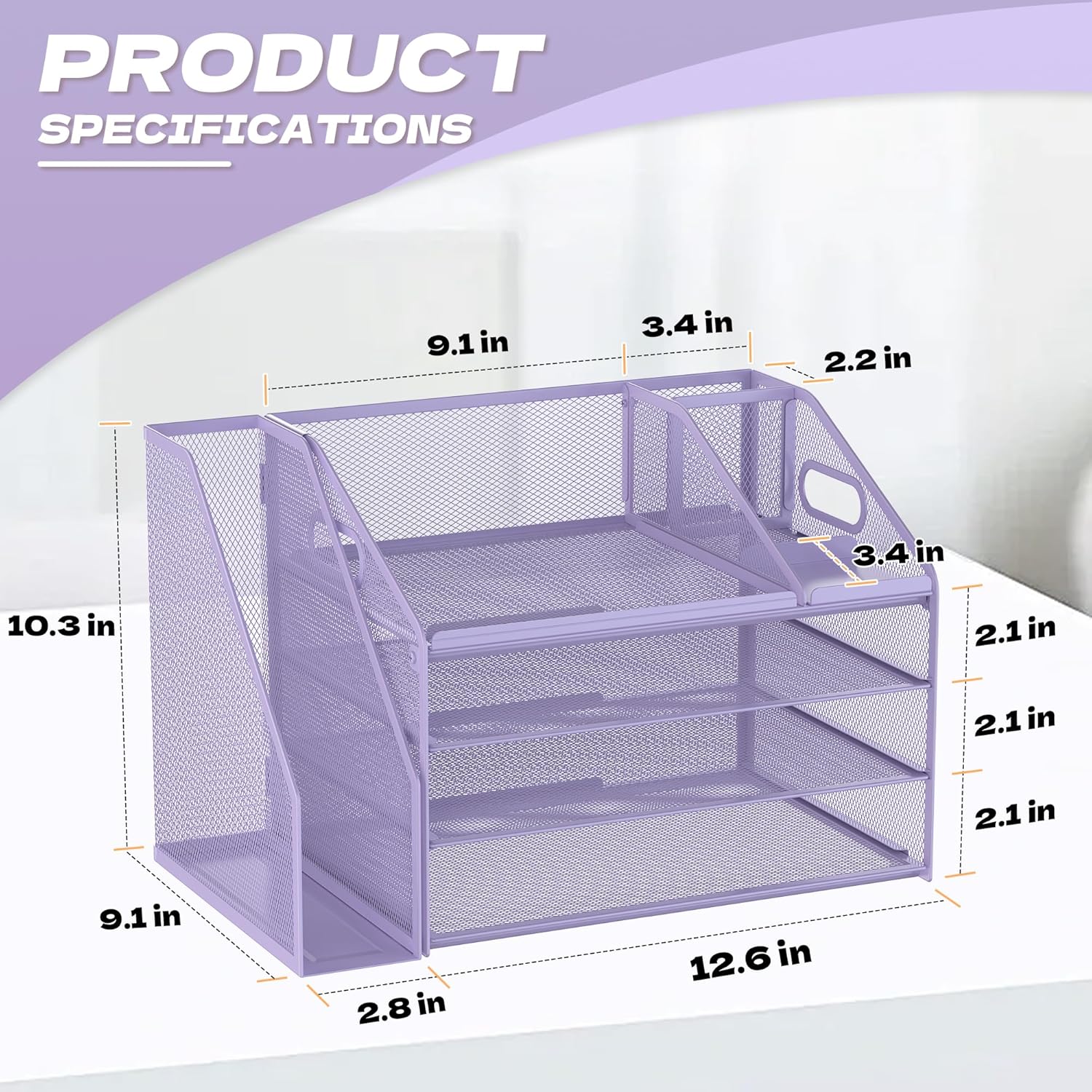 DocNest 4 Tier Paper Letter Tray File Organizer, Mesh Desk File with Handle, Workspace Desk Organizers with Pen Holder, Office Organization Storage Accessories - Purple