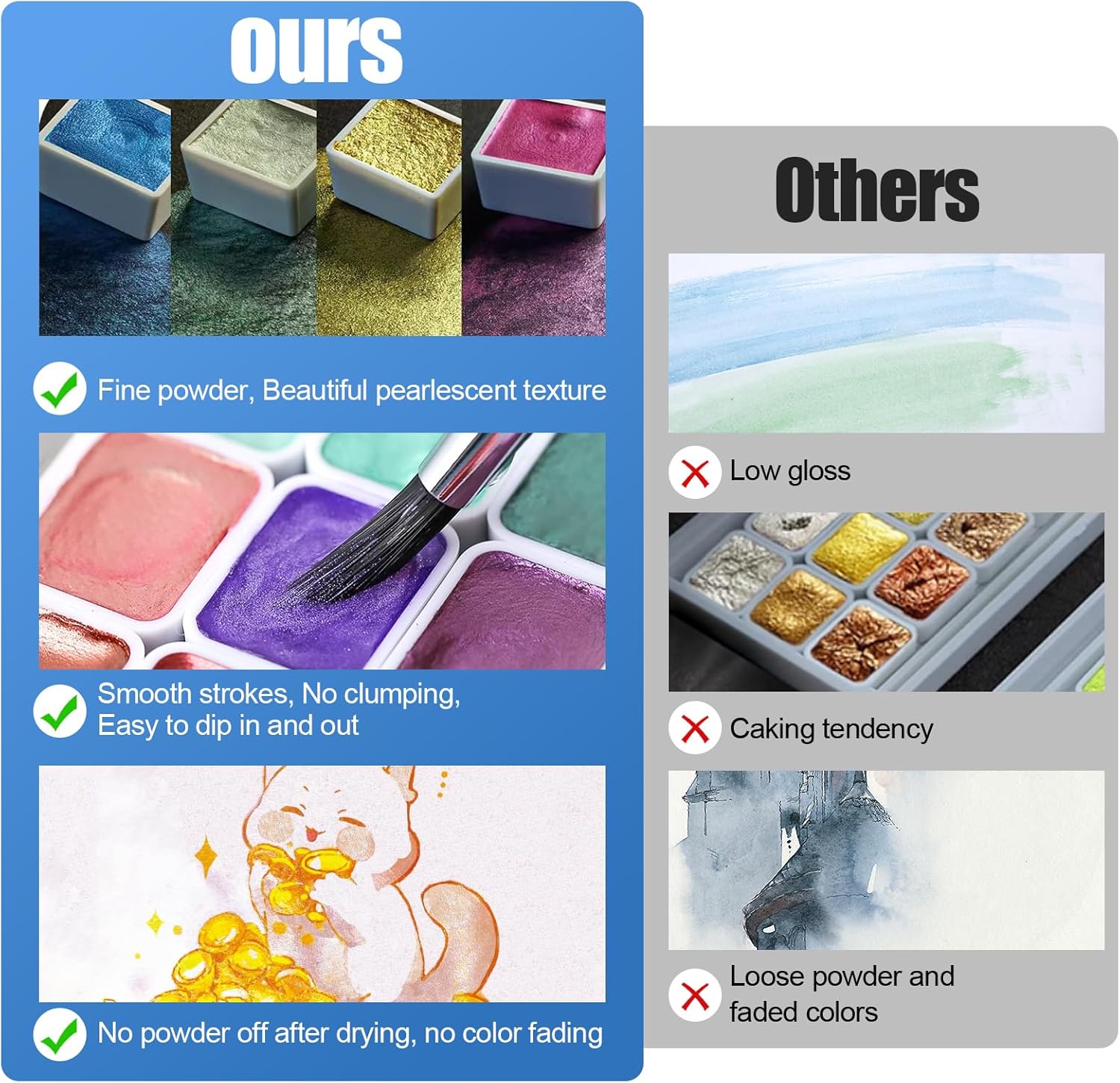 - 【Smooth Strokes, No Powder Off After Drying】: Our watercolor paints are fine powder with smooth strokes that won't clump. The powder will not fall off after drying, making the artwork shine forever