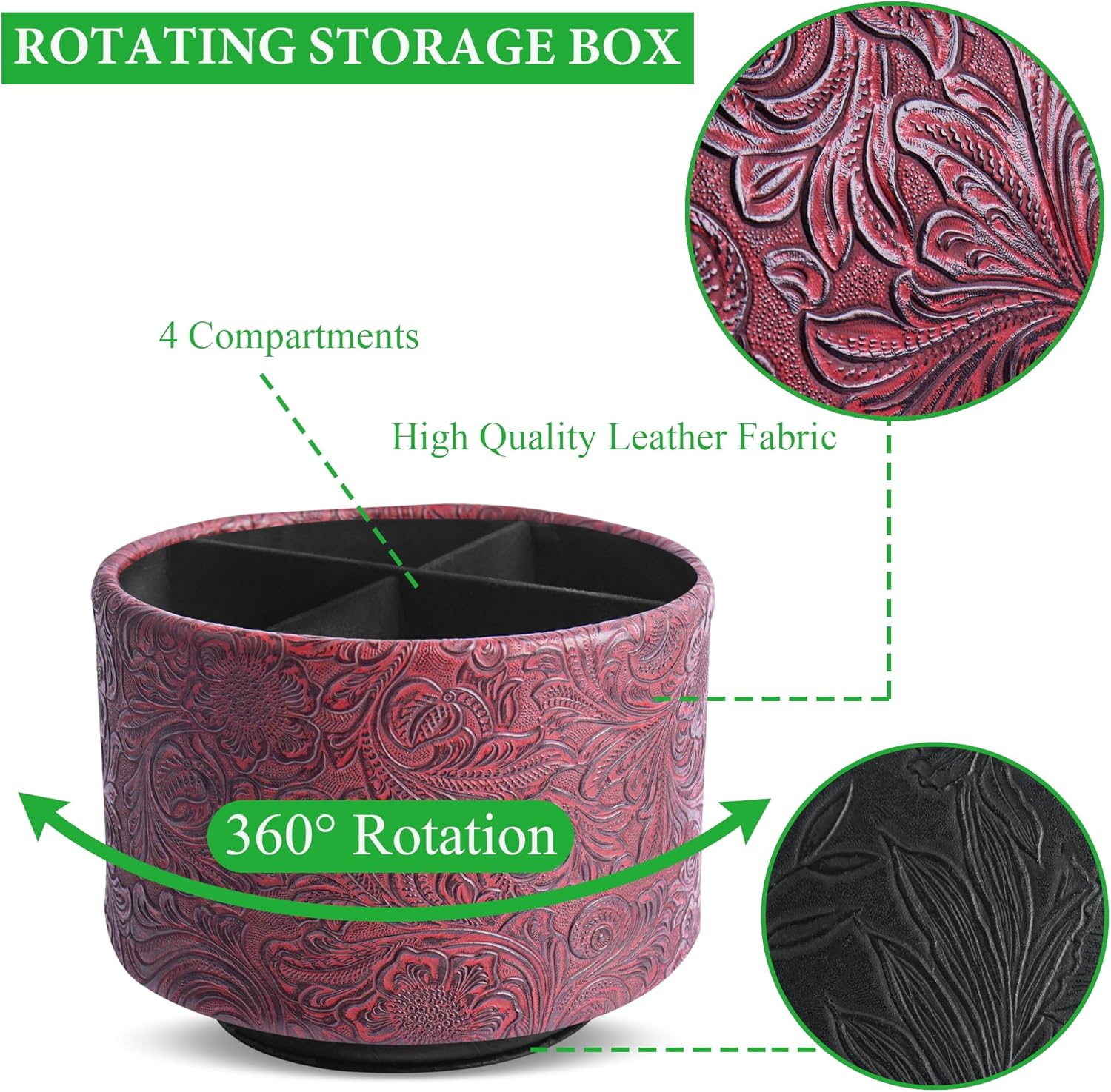 lizimandu Round Leather Art Supply Organizer,Remote Control Holder,360 Degree Spinning,Multi-Functional Pencil Holder,4 Compartments Desktop Stationary Organizer(1-Carved Red)