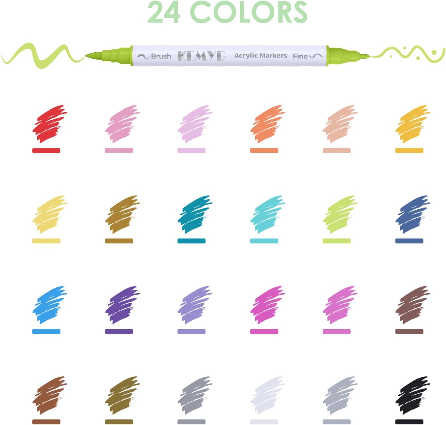 24 Colors Brush & Fine Tip Acrylic Paint Pens, Dual Tip Acrylic Paint Markers for Paper, Wood, Canvas, Stone, Rock, Glass, Fabric, DIY, Ceramic, Art Supplies for Kids and Adults Drawing