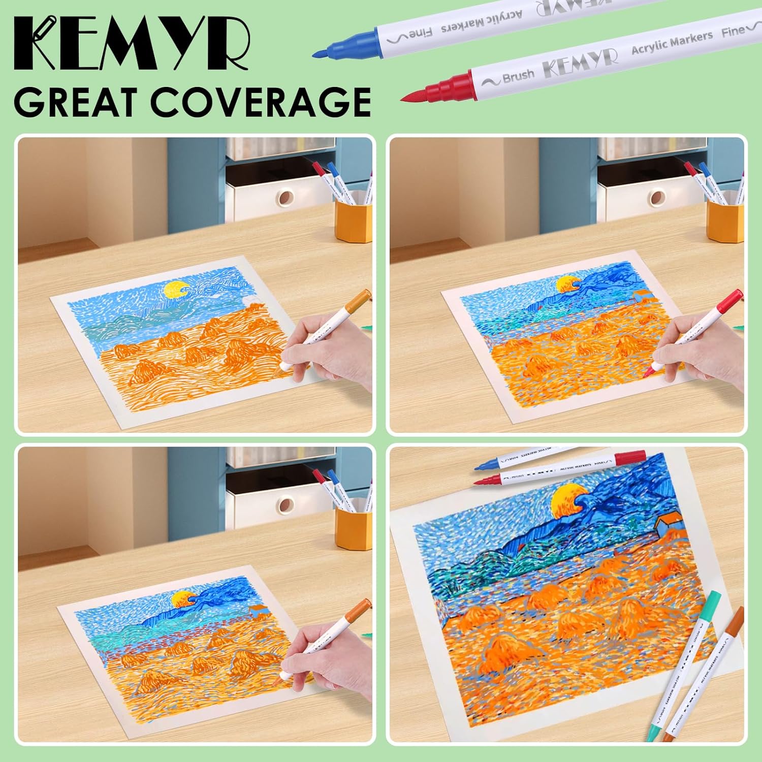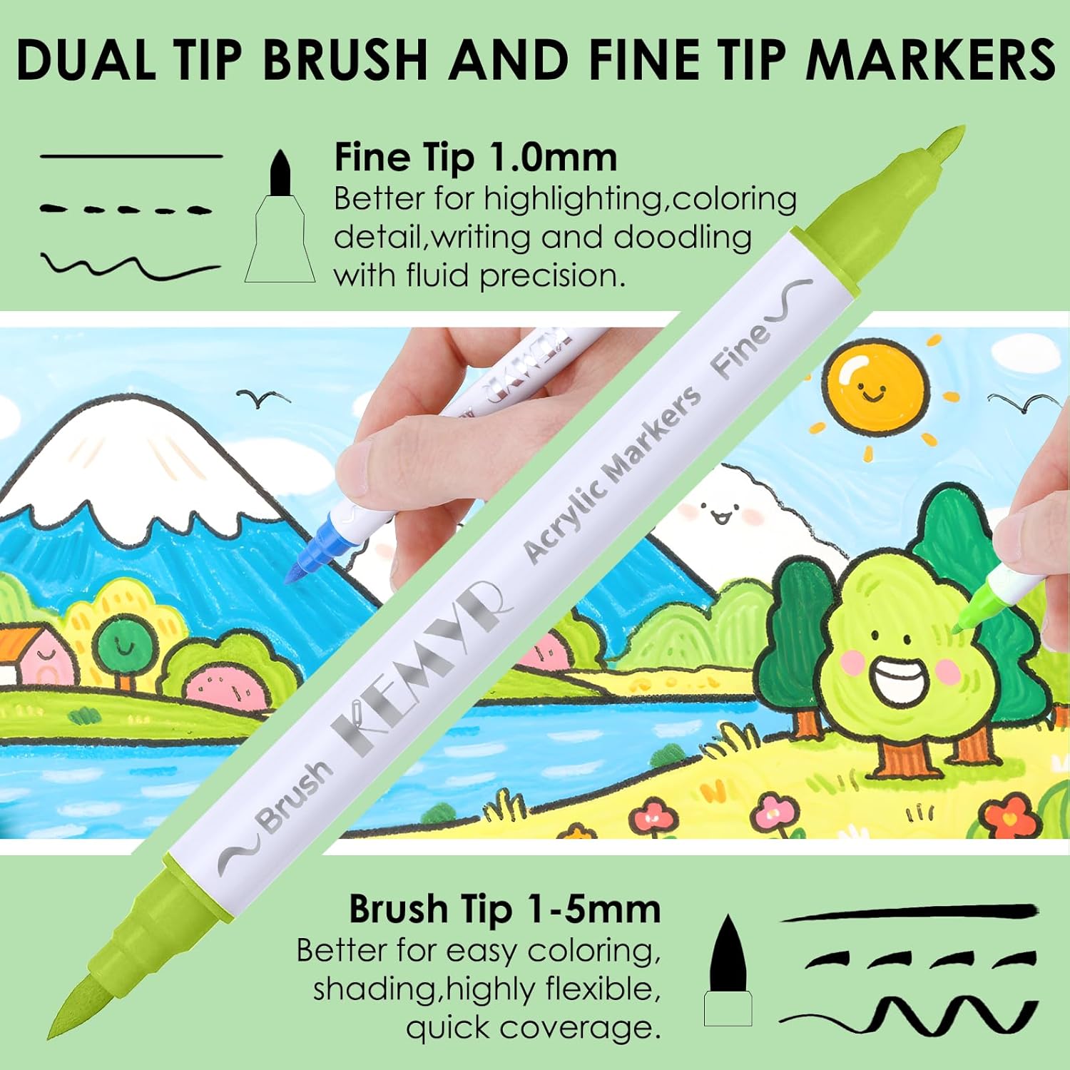 - Dual Tip Acrylic Paint Pens----Each KEMYR pen is equipped with a 1 mm fine tip for lines and details work, and a 1 - 5 mm brush tip for filling large areas and coloring. By changing the brush pressure, you can create different strokes, saving the trouble of changing tips.