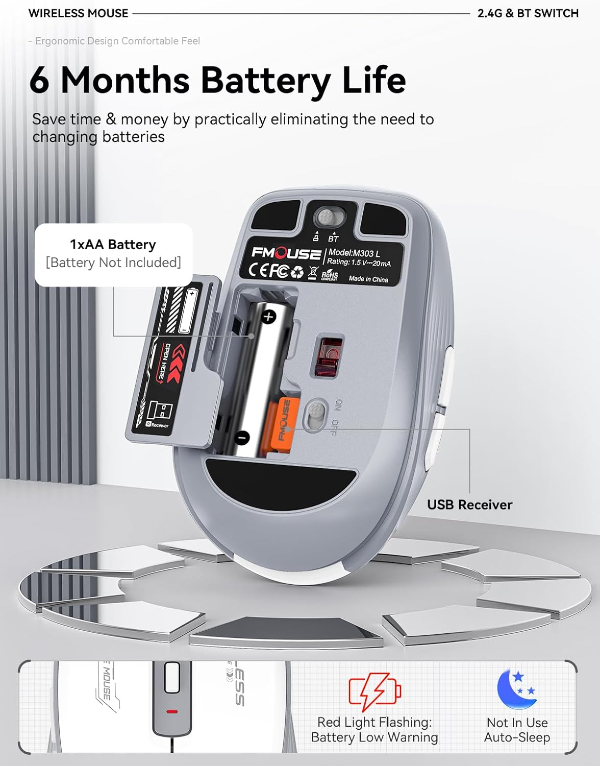 Wireless Mouse (Bluetooth & 2.4GHz USB) with Forward/Backward Side Keys, Silent Click, Ergonomic Portable AA Battery Mice for Laptop/Mac/iPad - Office & Travel Use, White & Grey
