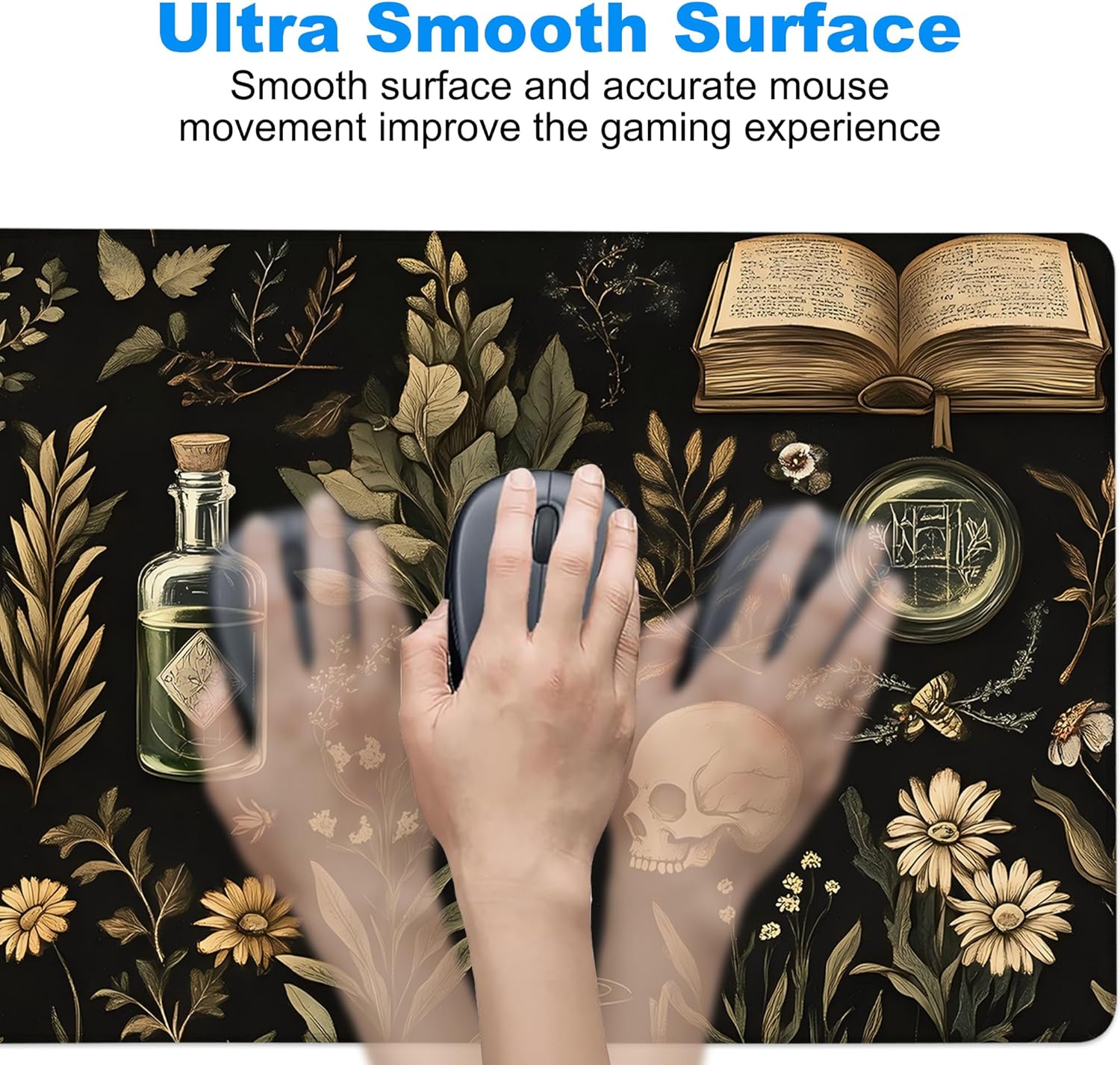 Desk Mat, Black Mystical Green Plant Skull Large Gaming Mouse Pad with Non-Slip Base Stitched Edges,Desk pad for Keyboard and Mouse Home Office 35.4"x15.7"