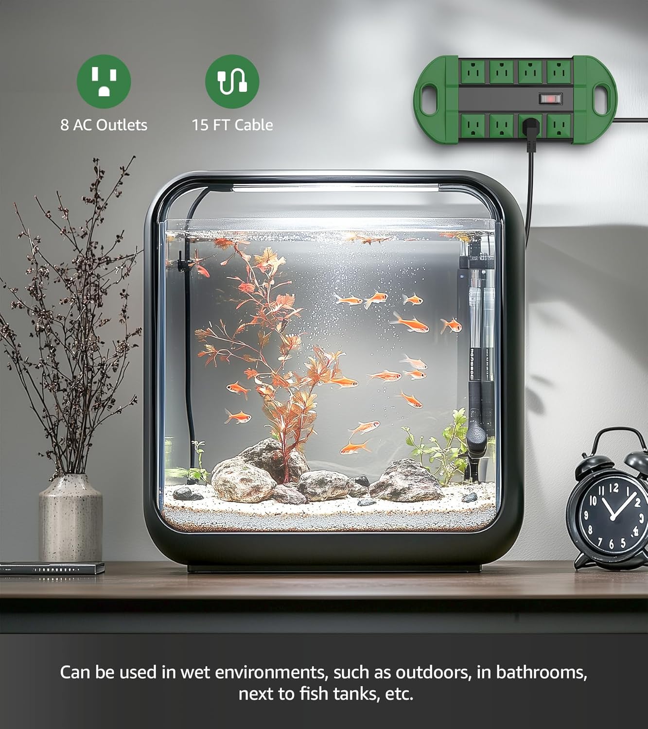 CCCEI Outdoor Power Strip Weatherproof with 8 Plug, Waterproof Extension Cord with Multiple Outlets, Christmas Exterior Garden Yard Surge Protector 15FT, Green.
