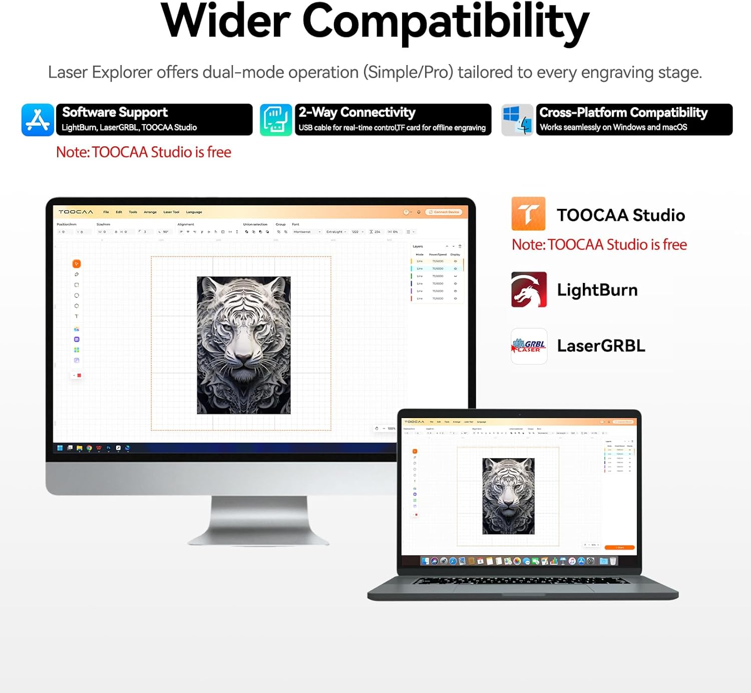 - 【Free engraving software】TOOCAA engraving machine provides free engraving software: TOOCAA Studio. It also supports popular software such as LightBurn and LaserGRBL. In addition, it also provides multiple connection methods and is compatible with multiple file formats, including JDXF,Picture. This engraving machine provides unparalleled flexibility.