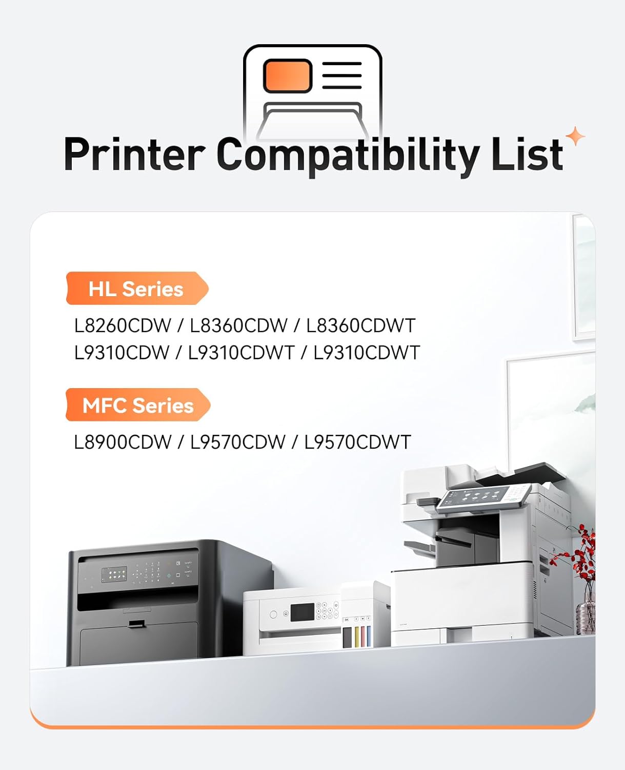 - Compatible Printers: Compatible with Brother HL Series Printer:HL-L8260CDW HL-L8360CDW HL-L8360CDWT HL-L9310CDW HL-L9310CDWT HL-L9310CDWT; Compatible with Brother MFC Series Printer:MFC-L8900CDW MFC-L9570CDW MFC-L9570CDWT.