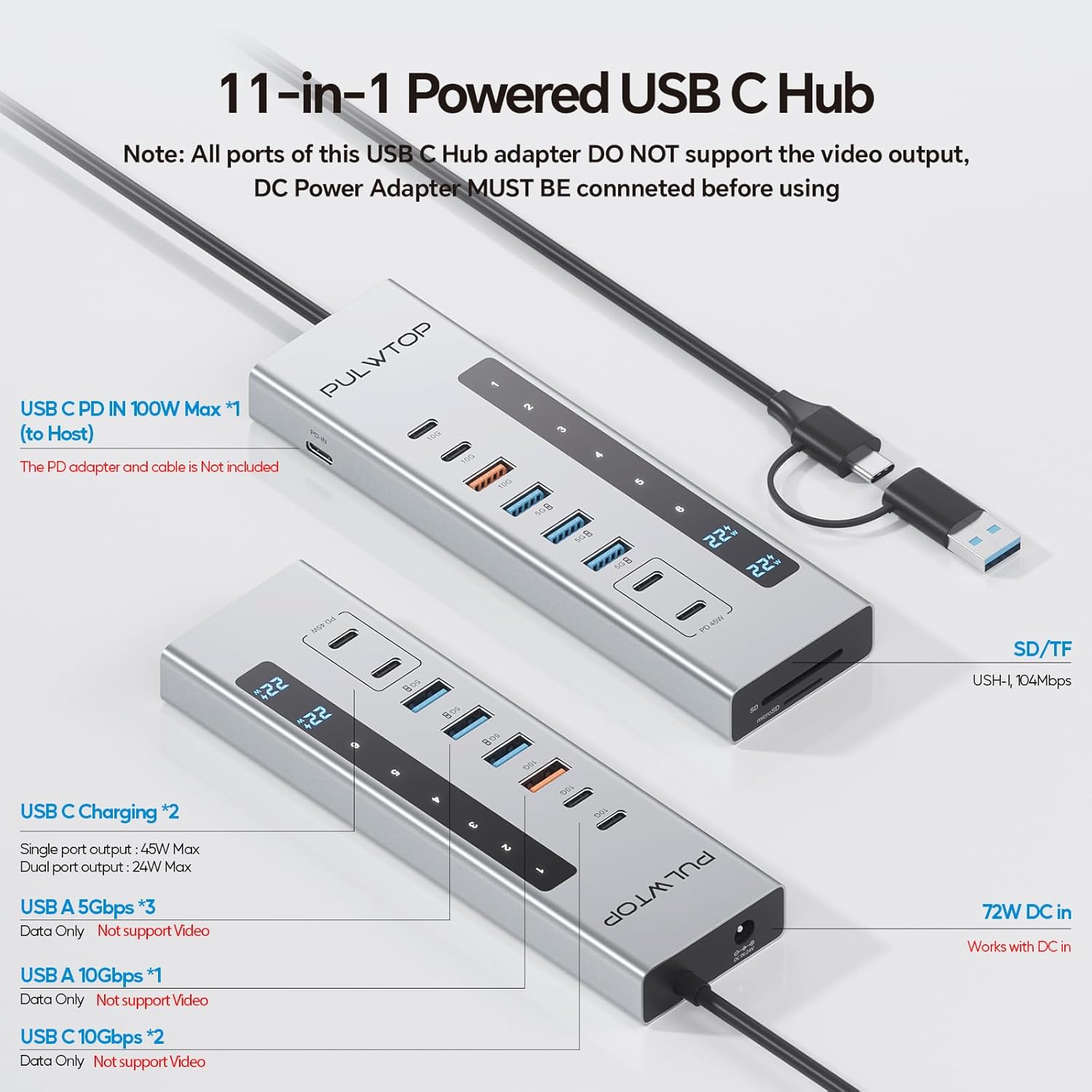 Powered USB C Hub, PULWTOP 11-in-1 USB Hub with SD/TF, 2*USB-C 10Gbps, 4*USB-A 5/10Gbps and 2 * 24/45W Type-C PD Charging Ports (Not Support Video), USB Powered Hub (72W DC Adapter Included)