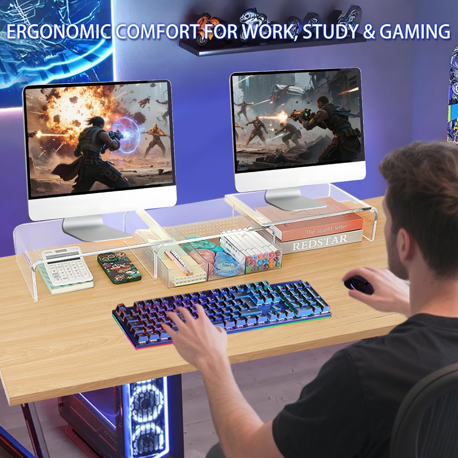 Clear Acrylic Desk Organizers and Accessories, Dual Computer Monitor Stand Riser with Drawer, Desk Shelf for Monitor, Workspace Desktop Organization for Office Supplies