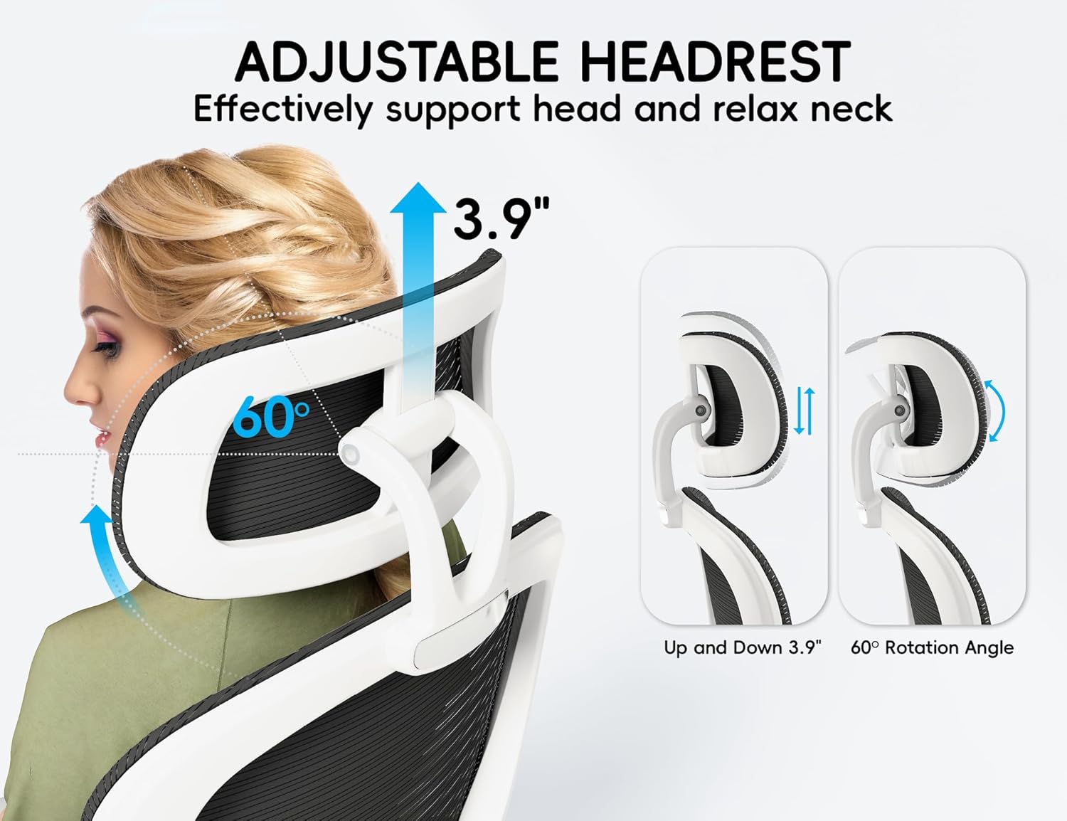 - Adjustable 3D Headrest for Neck & Shoulder Reliefļ¼Customize your comfort with our 3D adjustable headrest, designed to cradle your neck and shoulders in the ideal position. Tilt, height, and angle adjustments ensure proper alignment, reducing strain from hours at your desk. Finally, a chair that cares for your posture as much as you do