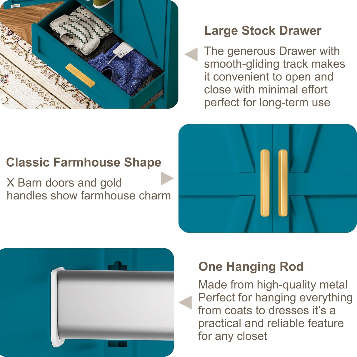 Metal Wardrobe Cabinet,71 Armoire Wardrobe Closet with Drawers and Hanging Rod,Metal Armoire with Adjustable Shelves for Closet,Bedroom,Farmhouse Storage Cabinet with Drawer(Blue)