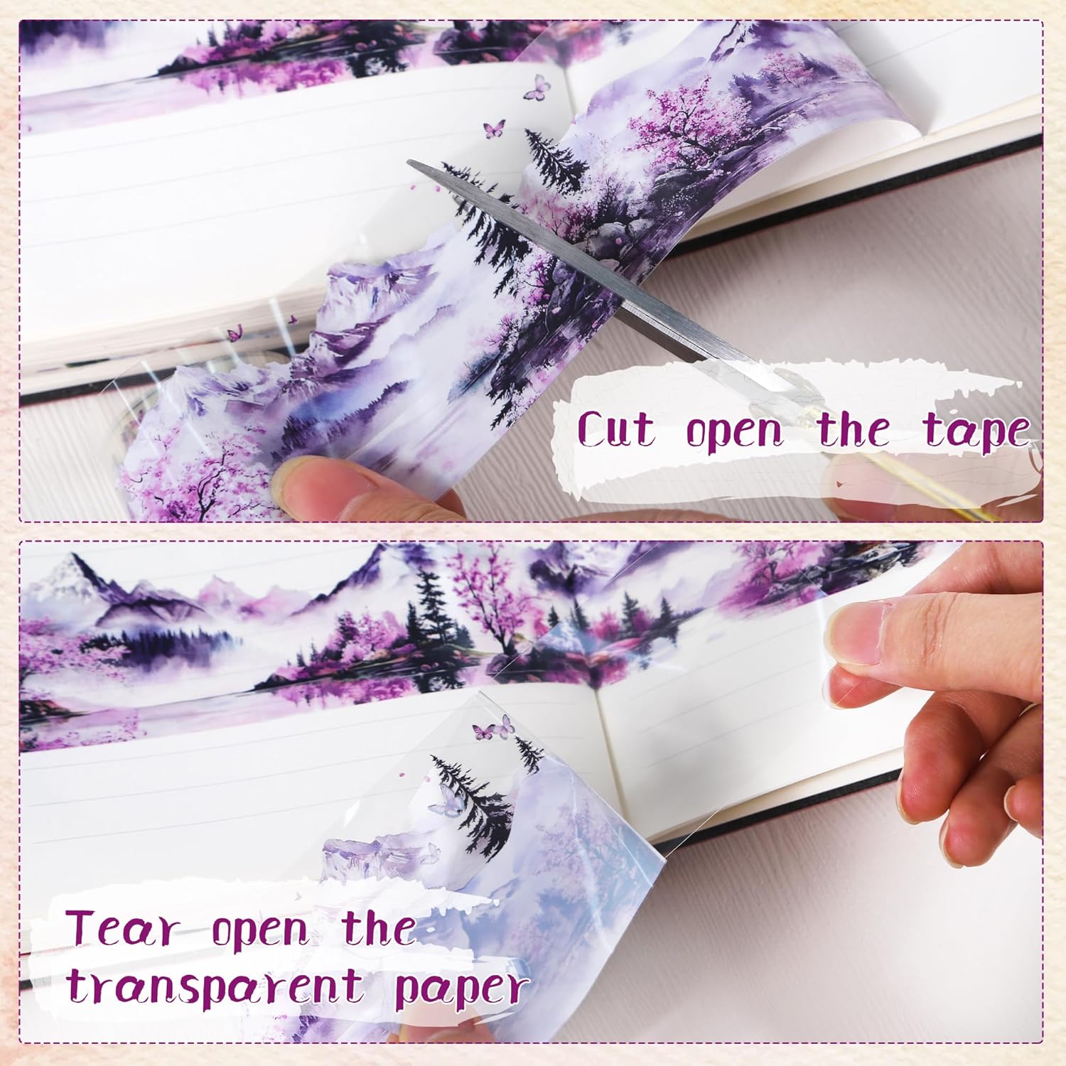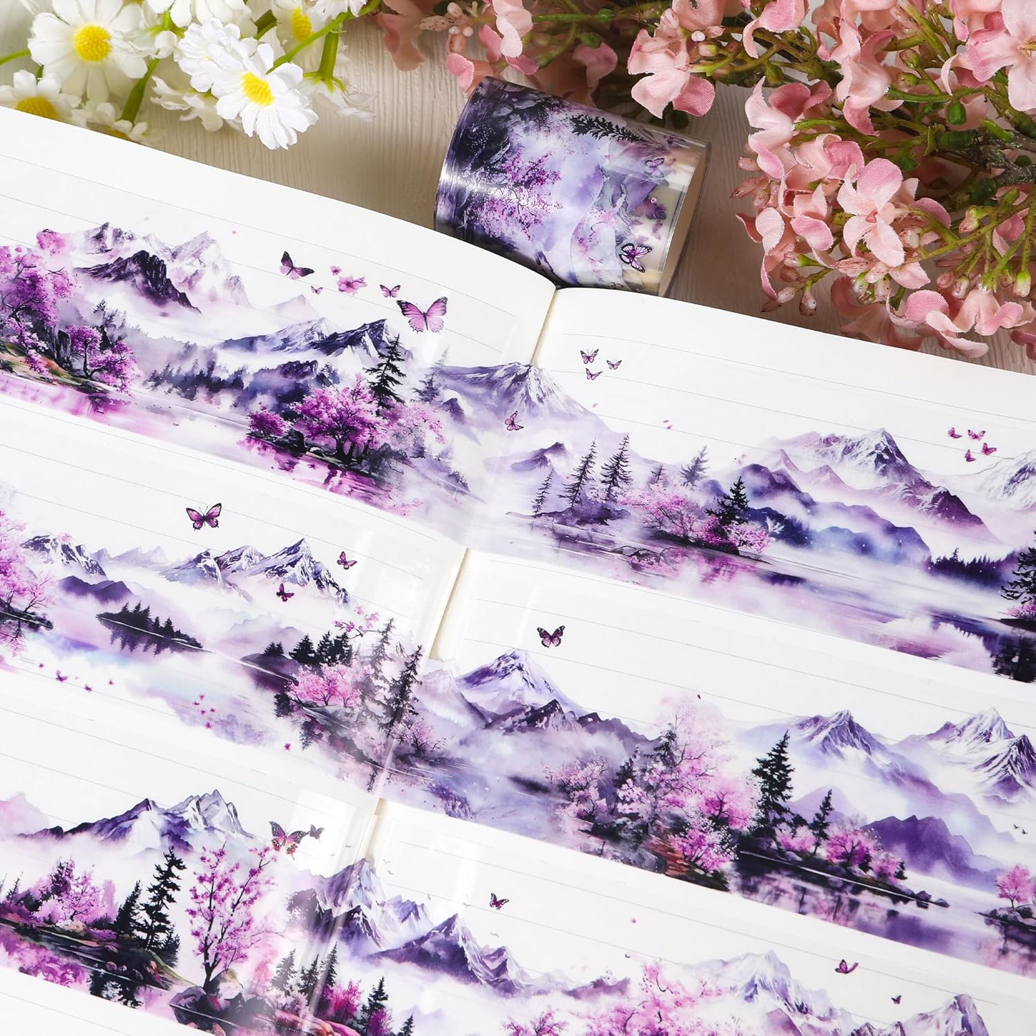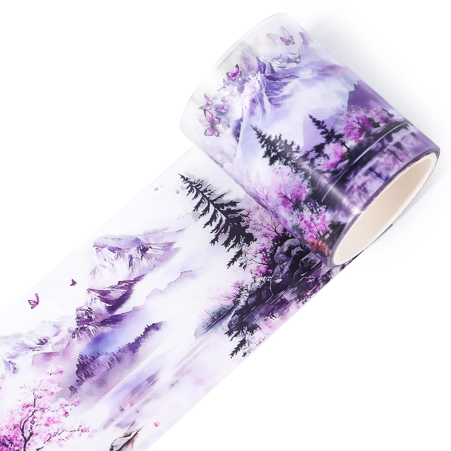 - Elegant Floral Mountain Design: This PET tape showcases exquisite watercolor illustrations of cherry mountain blossoms and butterflies, adding a touch of serenity and beauty to your creative endeavors