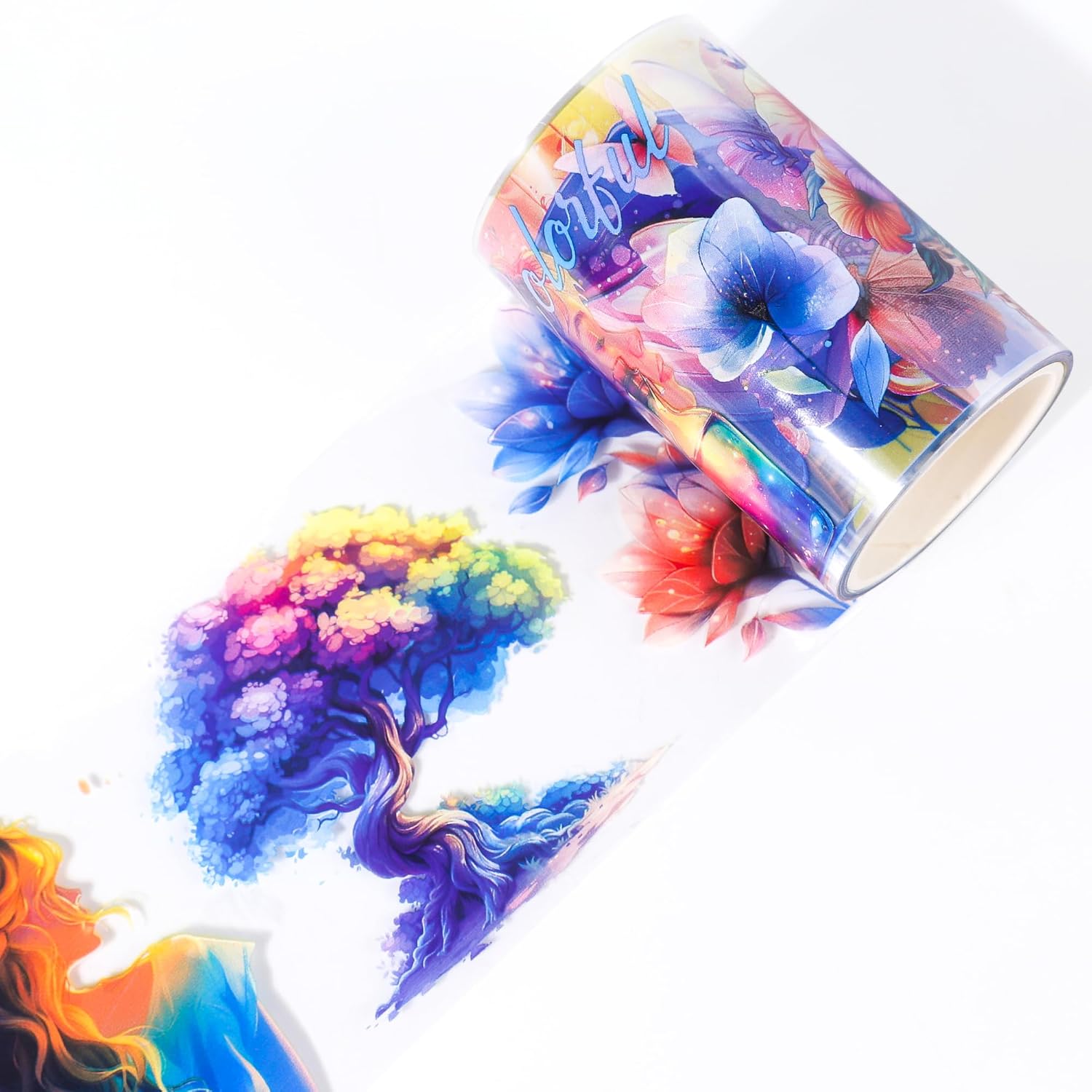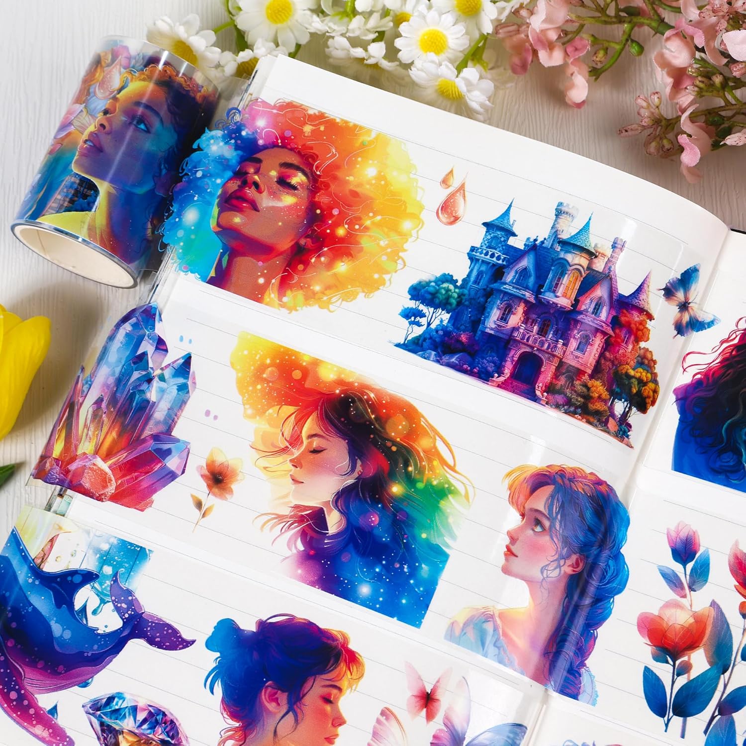 - Vibrant Design Scrapbook Tape: This PET tape showcases a stunning array of colorful illustrations, including enchanting characters, flowers, and vivid landscapes, adding a magical touch to your projects