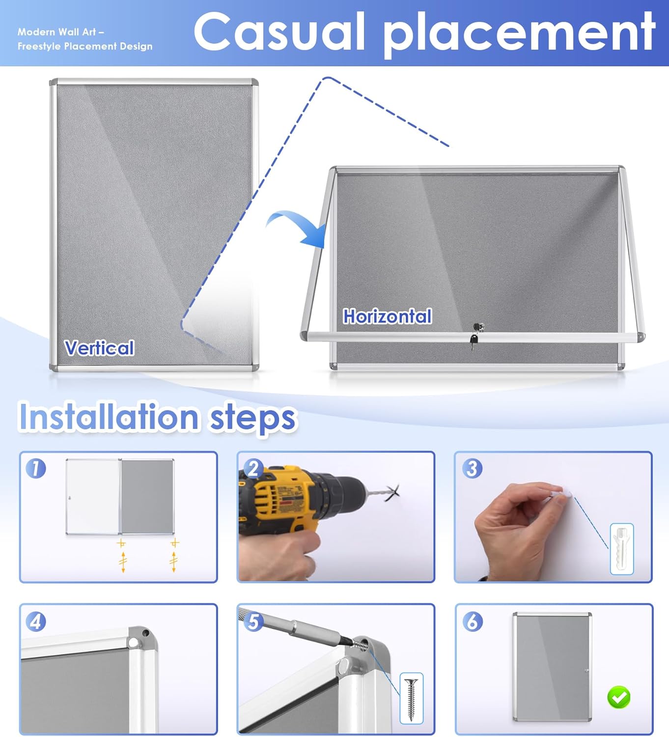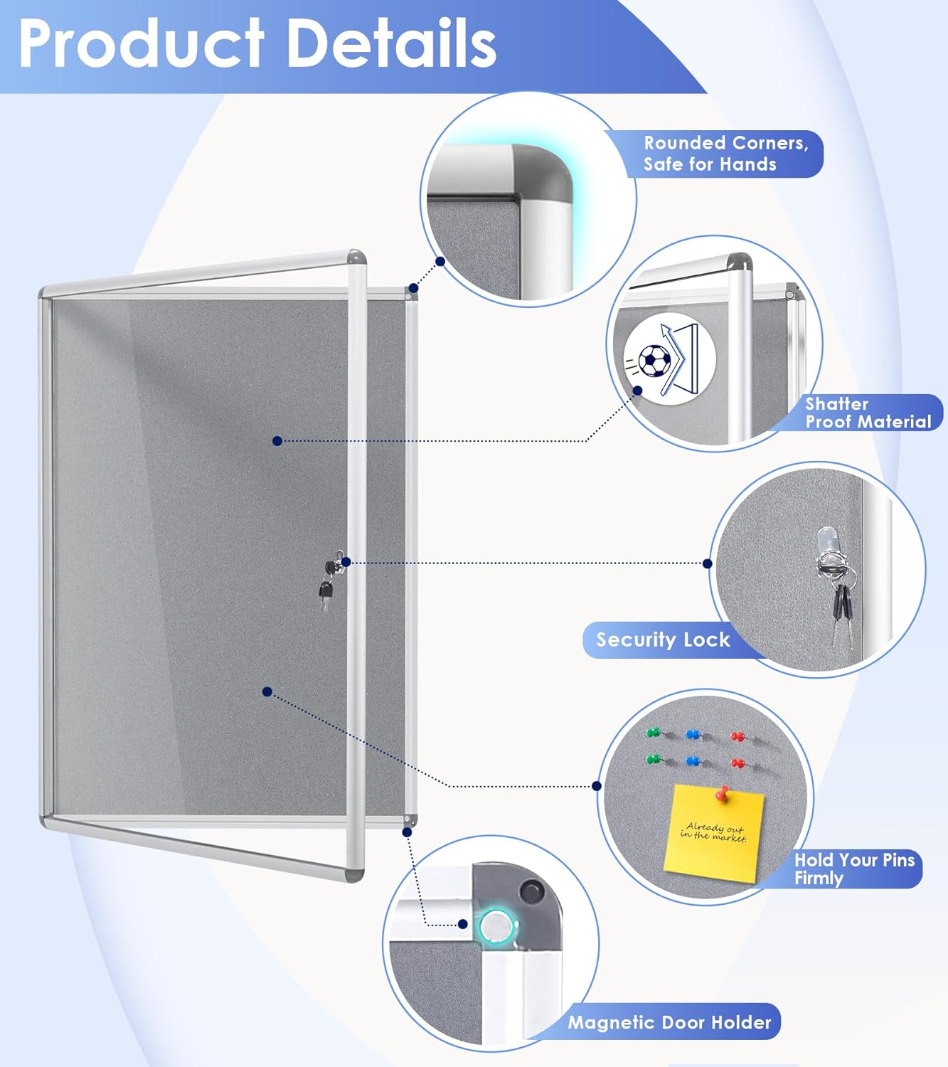 SWANCROWN Enclosed Bulletin Board 36x24 in, Tamperproof Lockable Grey Felt Board Wall Display Case for Office School Home, Aluminum Frame