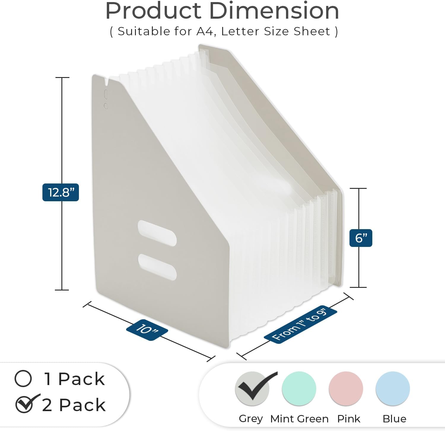 - Folder Dimension - Measuring 12.8” L x 10” H, Adjust Width from 1” to 9” . You will receive 2 pack of grey plastic file organizer. For further problem, please feel free to contact us
