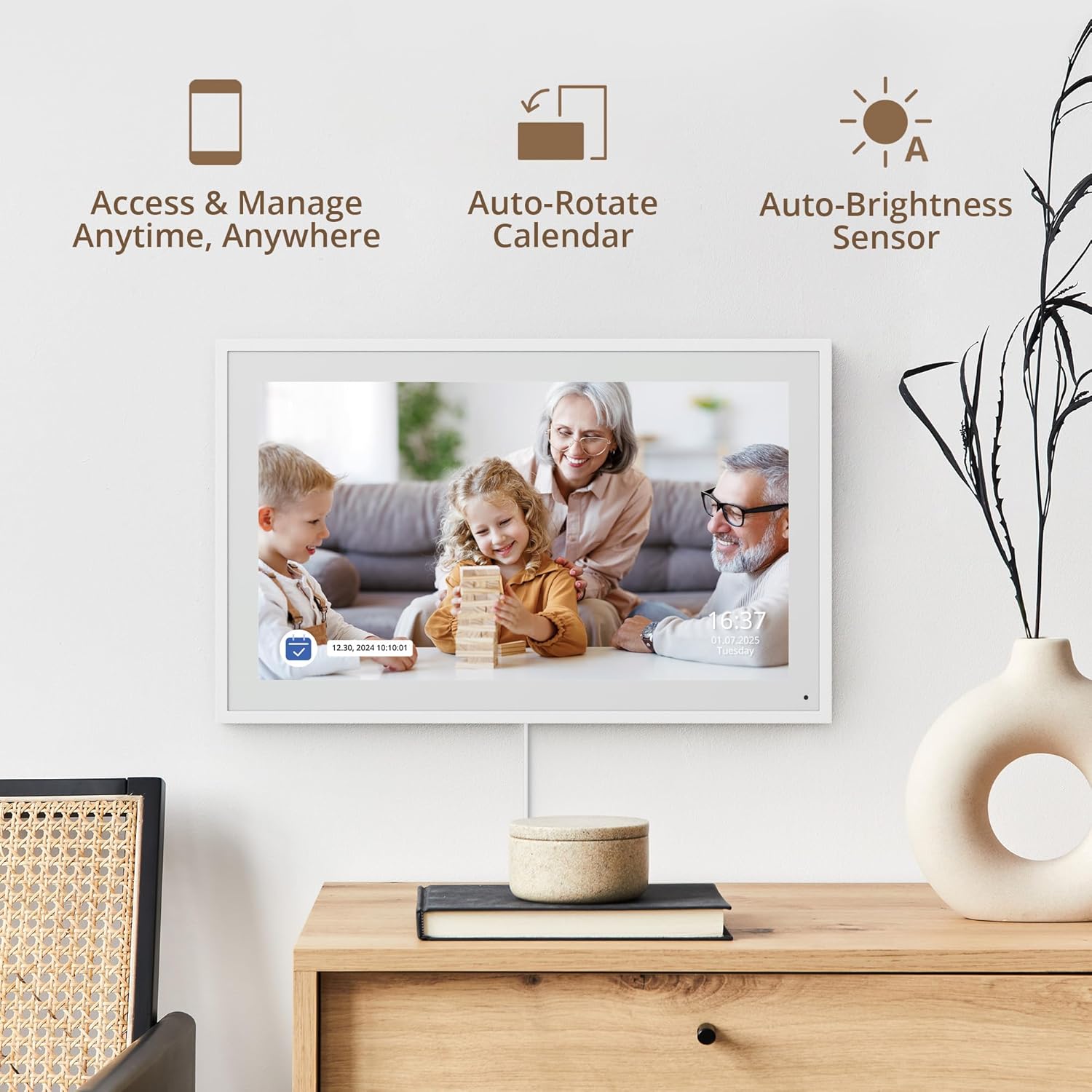 - 【Easy Setup and Auto-Sync】: Enjoy a user-friendly design that our smart picture frame allows for quick setup—just plug in, connect to Wi-Fi, and link your calendar to the Mobile App. Once synced, it seamlessly integrates multiple personal calendars (iOS, Google, etc.) into one unified interface. Authorize additional devices for even greater convenience.