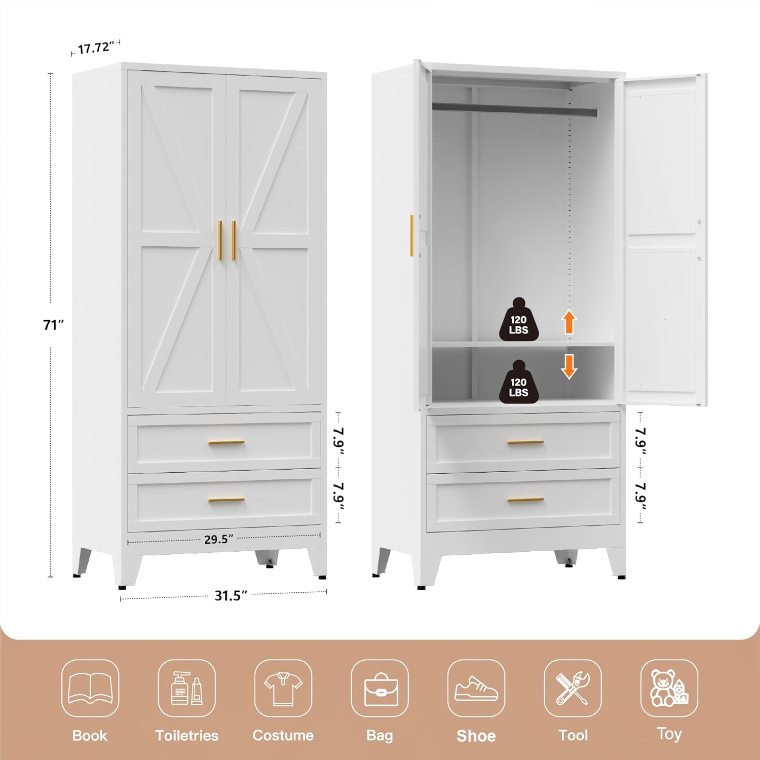 71" Tall Metal Wardrobe Cabinet with 2 Drawers and Hanging Rod, 2 Doors Armoire Wardrobe Closet with Shelf for Bedroom, Office, Laundry Room, White