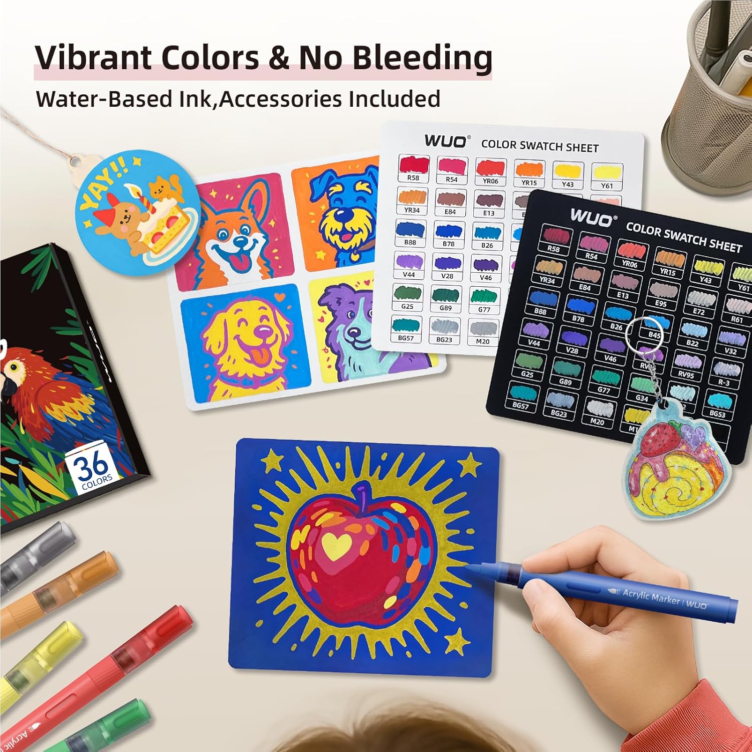 WUO 36 Colors Acrylic Paint Markers (2 Metallic), Automatic Ink Control Brush Tip for Multi-Surface Acrylic Paint Pens for Rock Painting, Wood, Canvas, Glass, DIY Art