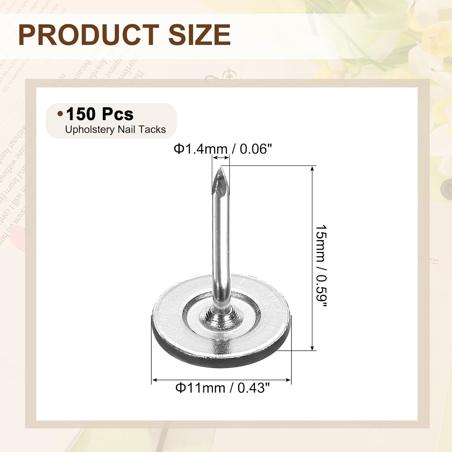 - [Size & Quantity] - The package comes with 150pcs decorative upholstery tacks. Sufficient quantity to meet your different daily needs. The overall size of upholstery nails is about 11mm x 15mm/0.43-inch x 0.59-inch(D*H)