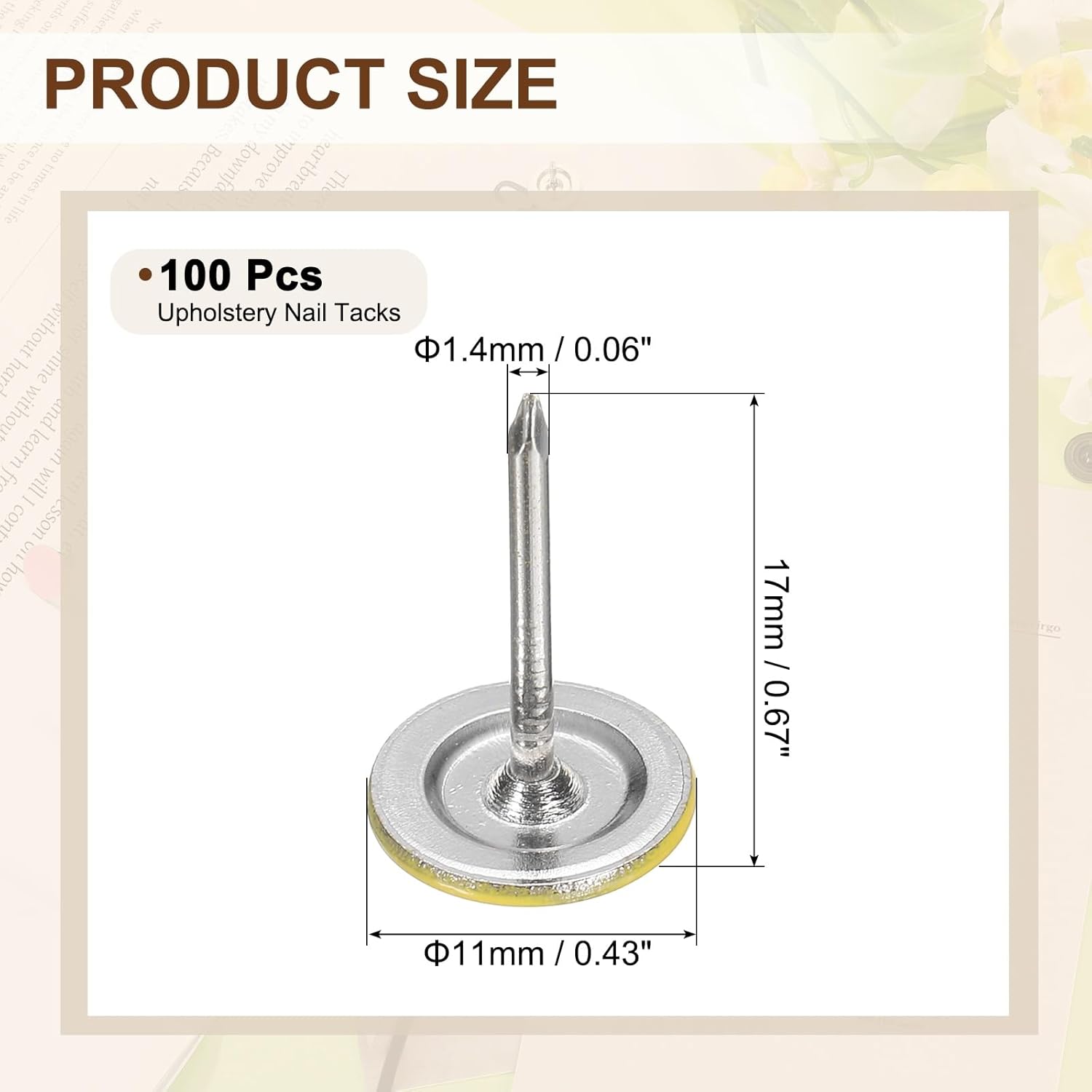 - [Size & Quantity] - The package comes with 100pcs decorative upholstery tacks. Sufficient quantity to meet your different daily needs. The overall size of upholstery nails is about 11mm x 17mm/0.43-inch x 0.67-inch(D*H)