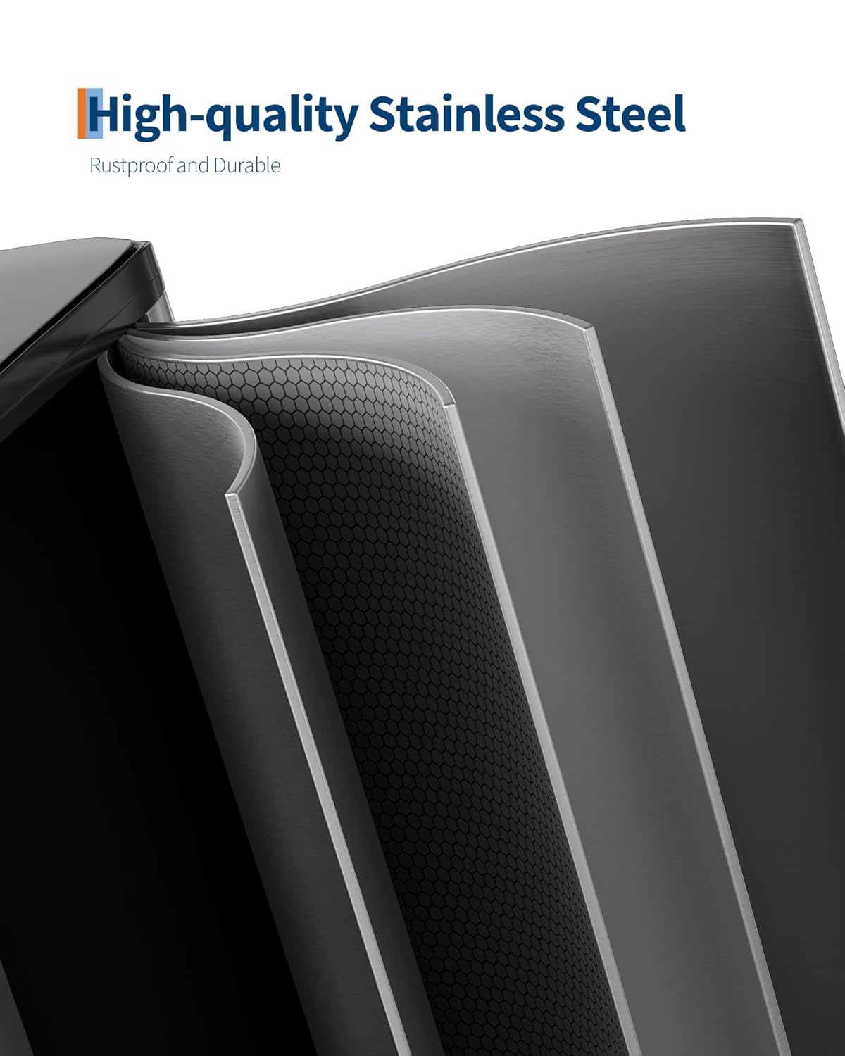- [HIGH-QUALITY MATERIALS] – GarveeHome stainless steel trash can with lid is engineered for longevity. Its 410-grade ferritic stainless-steel shell delivers rustproof strength, scratch resistance and lasting luster. Two polypropylene inner buckets repel stains, odors and moisture. A thick ABS lid with stainless overlay resists dents; the industrial steel pedal endures 150,000+ steps and the one-piece ABS hinge survives over 300,000 open/close cycles