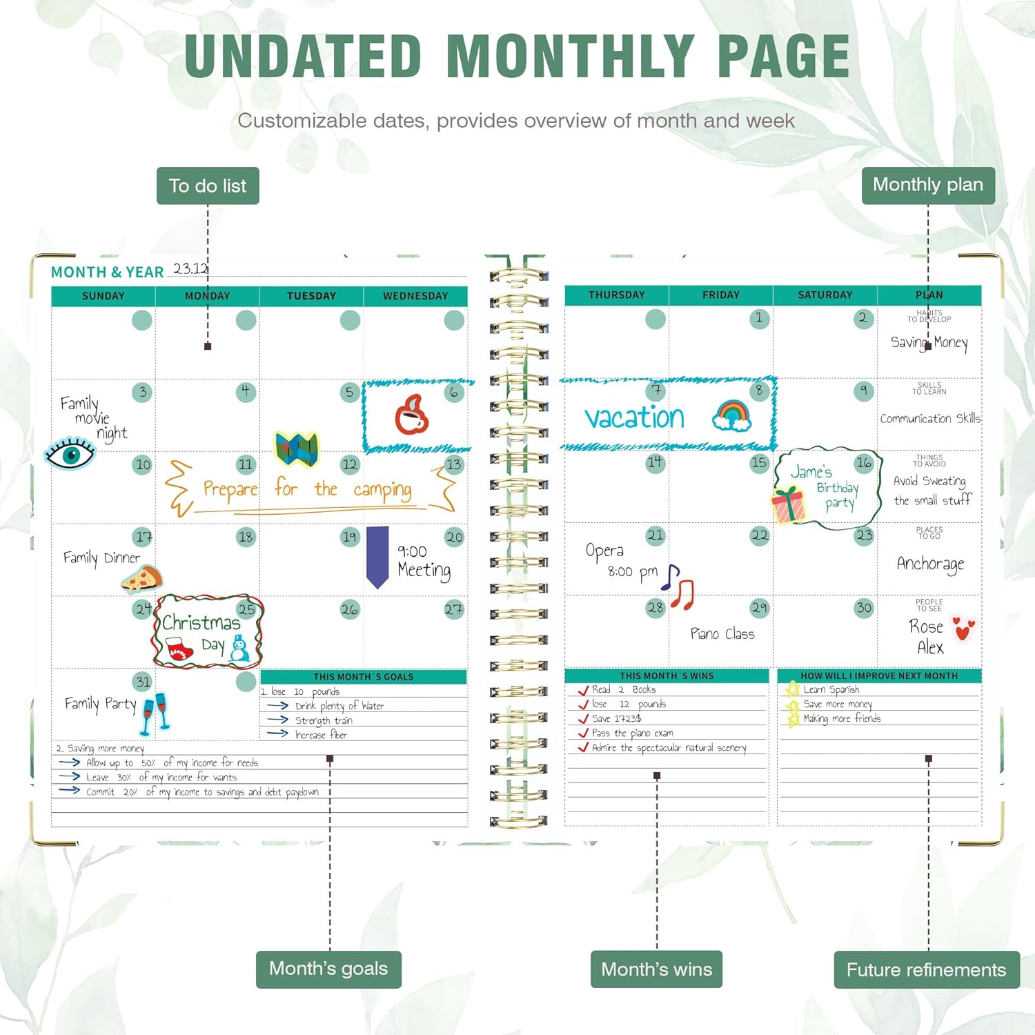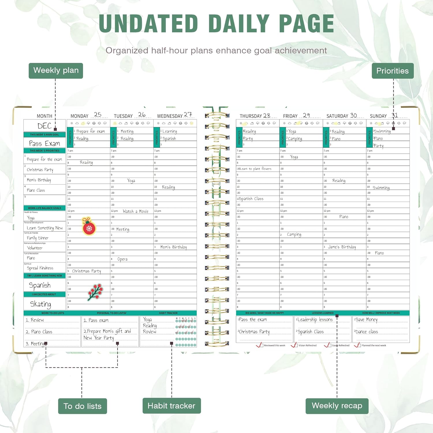 - Boost Your Productivity: Additional accessories included: instructions, bookmarks, stickers, and labels. Whether for work, study, or personal use, undated planner is the perfect tool for achieving your daily priorities and taking control of your schedule.