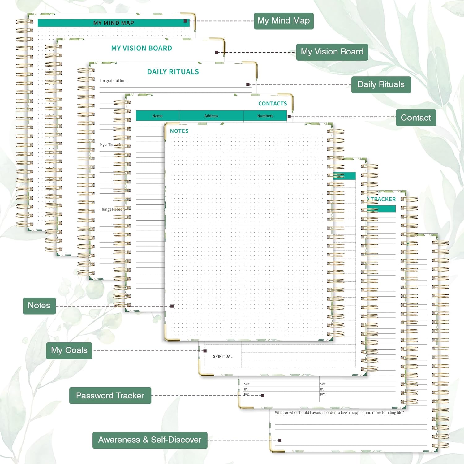 - Undated Clear Layout: With 12 blank months and 53 weeks, a 7 AM to 8 PM daily schedule section, and additional sections for contacts, passwords, awareness and self-discovery, daily rituals, goals, and notes, this life planner offers the freedom to plan your schedules at any time.