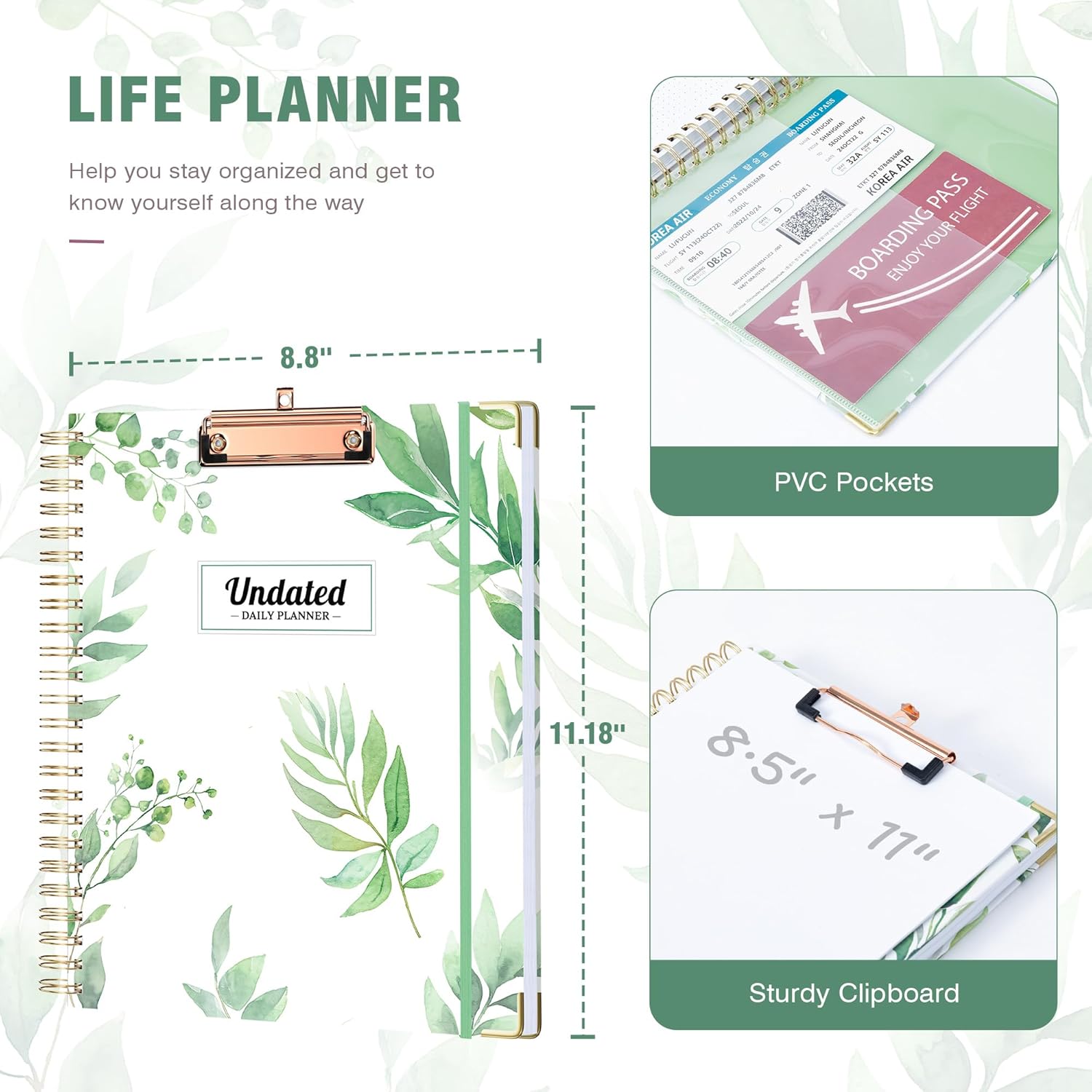- Planner Features: The clip provides easy gripping and can hold up to 80-100 sheets of paper, ensuring that your notes stay secure. PVC pockets store cards or small items. Corner protectors prevent damage, and an elastic band keeps everything organized and secure.
