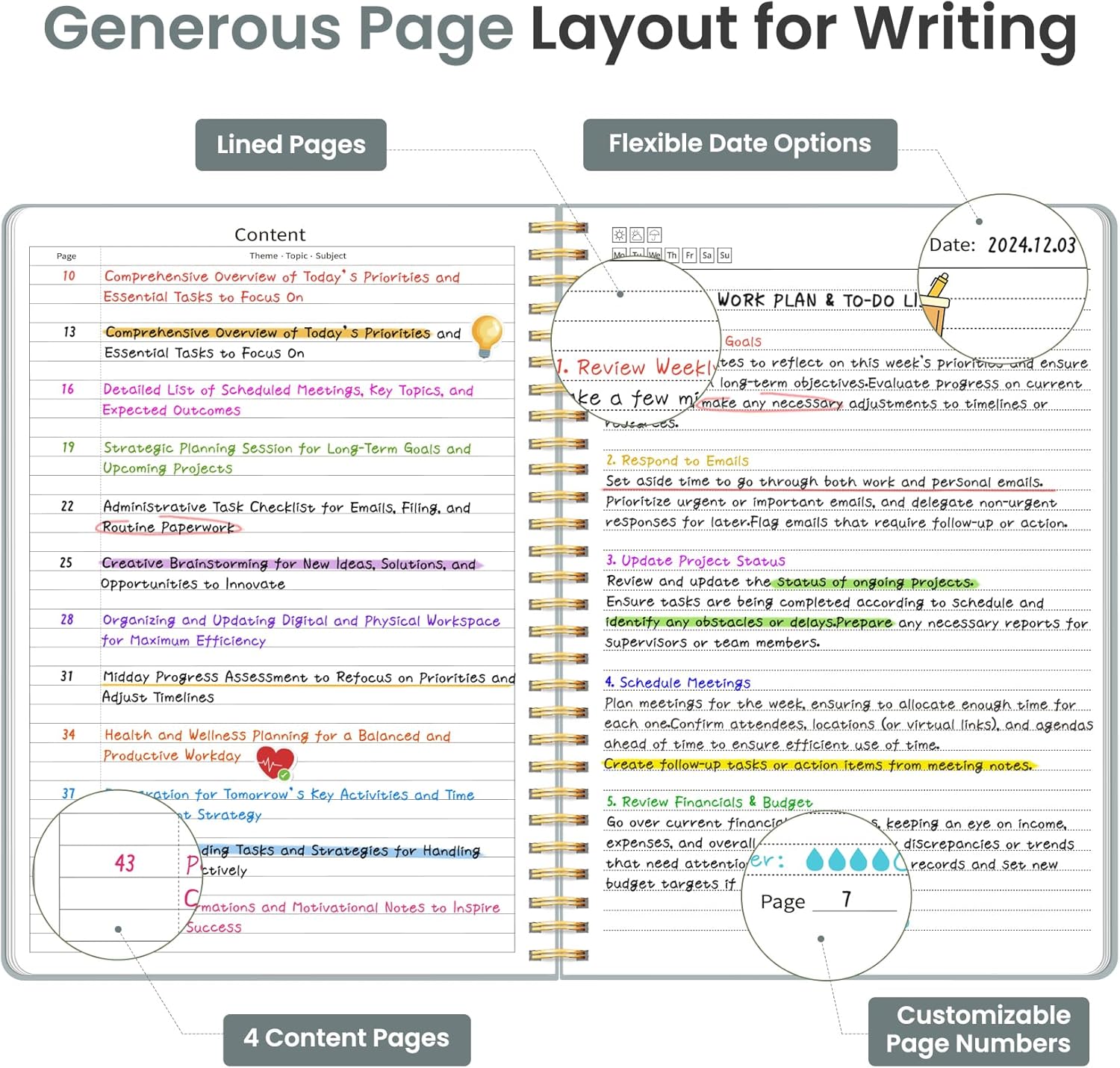 - Large A4 Spiral Notebook: Measuring 8.5" x 11" with standard 7mm college-ruled lines, this large A4 notebook offers ample space for detailed note-taking, journaling, and task management. Its spacious pages are perfect for capturing ideas, organizing thoughts, and managing projects—whether at work, school, or in your home office.
