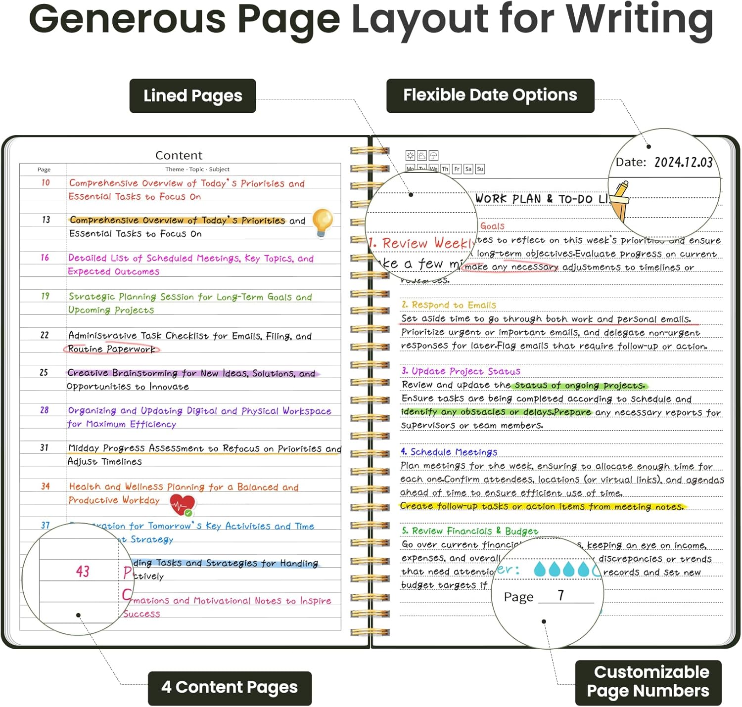 - Customizable Pages & Table of Contents: Includes 4 table of contents pages to keep your notes organized and easy to reference. Contains 50 sheets/100 lined pages that allow you to write on both sides, each page allows you to customize page numbers and dates, making it the ultimate notebook for you.