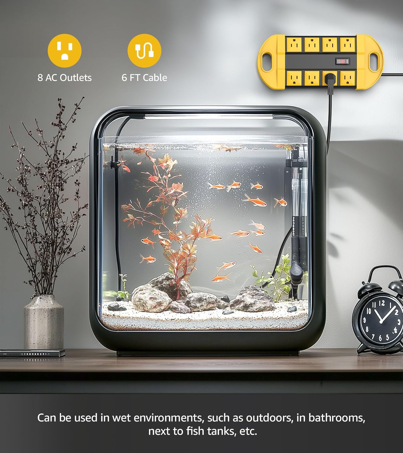 CCCEI GFCI Outdoor Power Strip Weatherproof with 8 AC, Waterproof Extension Cord with Multiple Outlets, Wall Mount Surge Protector Flat Plug, Christmas Exterior Garden, Yard, 6FT, Yellow.