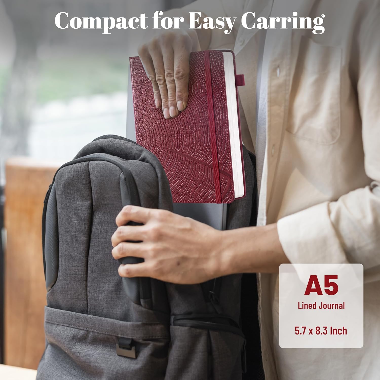 CAGIE Lined Journal for Women Men, Tree Growth Ring Leather Bound Journal Notebook, 256 Pages 100 GSM Journals for Writing, A5 Hardcover Journaling Notebooks for Work, Note Taking (Red