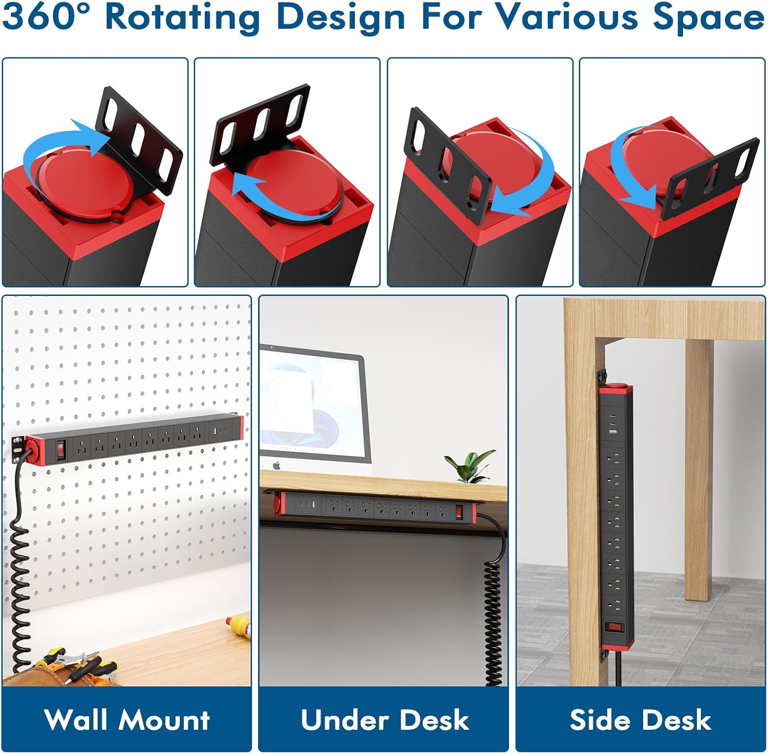 - Multi-position Mounting Design :The 360° rotating feature of this power strip is a really handy feature. It allows you to adjust the outlets in any direction, making it incredibly easy to plug in various devices with different plug orientations.