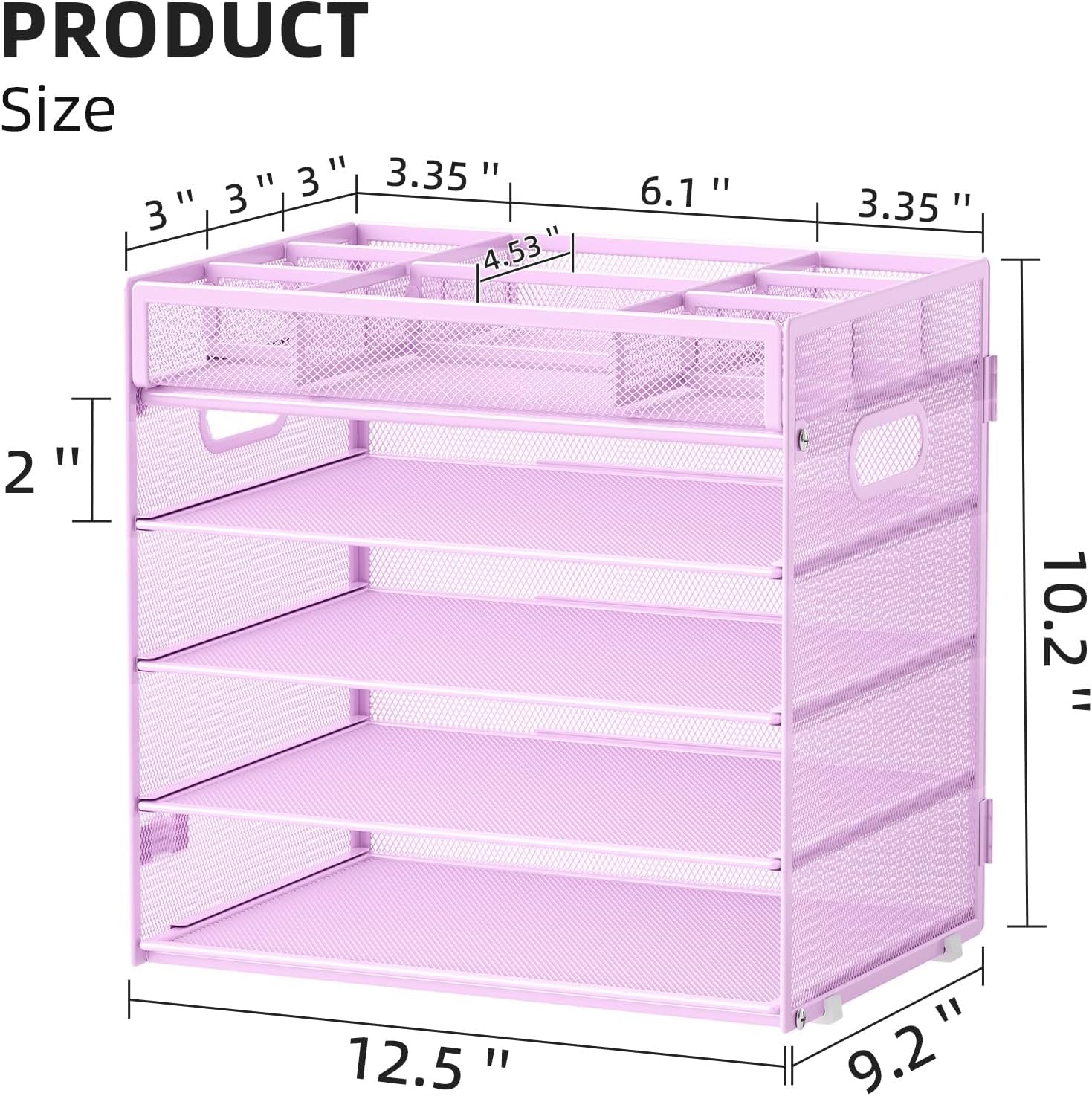 Marbrasse 5-Tier Letter Tray Paper Organizer with Handle, Multi-Functional Mesh File Organizer for Desk, Adjustable Compartments Mesh Desktop Storage for Office Supplies, Purple