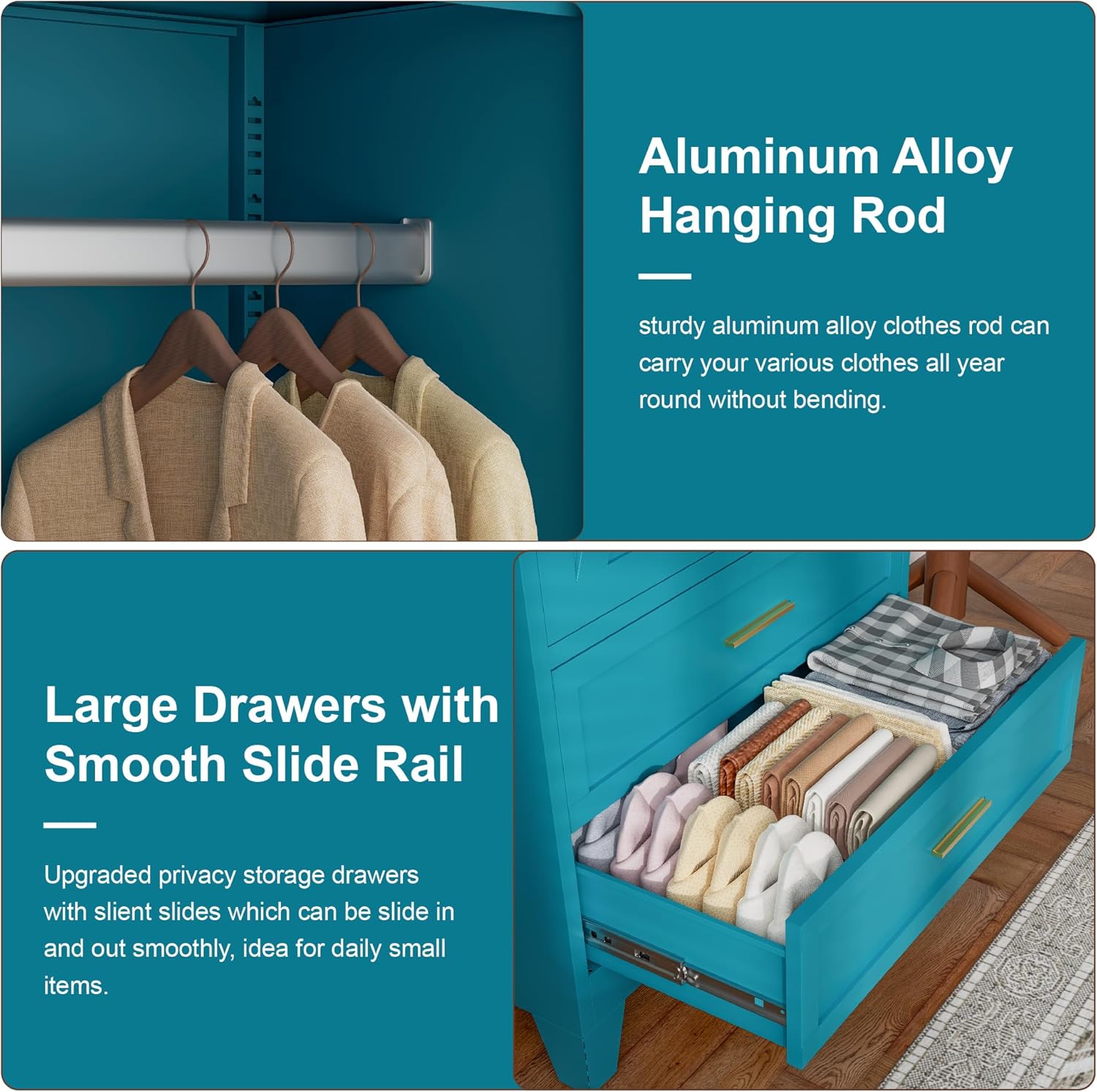 - Convenient Drawers Design: The bedroom armoire includes two spacious drawers at the bottom, providing storage space for smaller items such as underwear, socks, or others. The smooth glide system ensures a hassle-free opening and closing