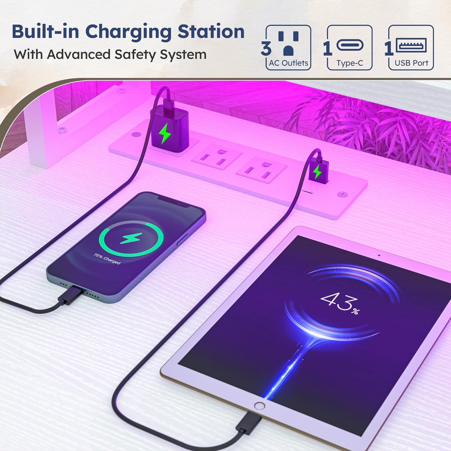 L Shaped Computer Desk with Drawers, Gaming Desk with LED Lights & Monitor Shelf, Office Desks with Power Outlets, Corner Desks for Home Office, Study Room and Bedroom, White