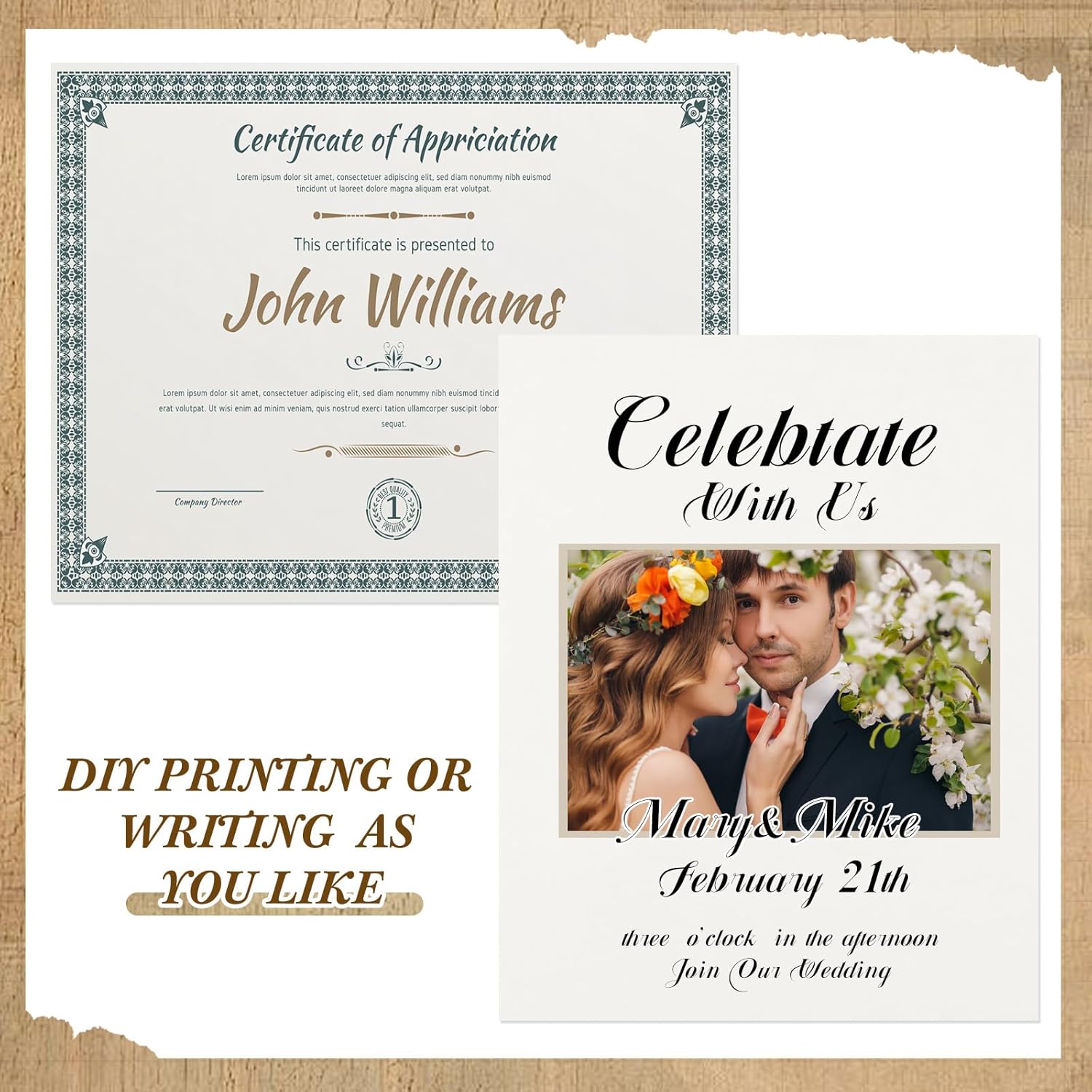 - Work As Different Things: these plain certificate papers are flexible in use, you can use them as certificate printing, wedding invitation, birthday invitation, restaurant menu, theme party decoration and so on, running smoothly in laser and inkjet printers, copiers and offset applications without jams