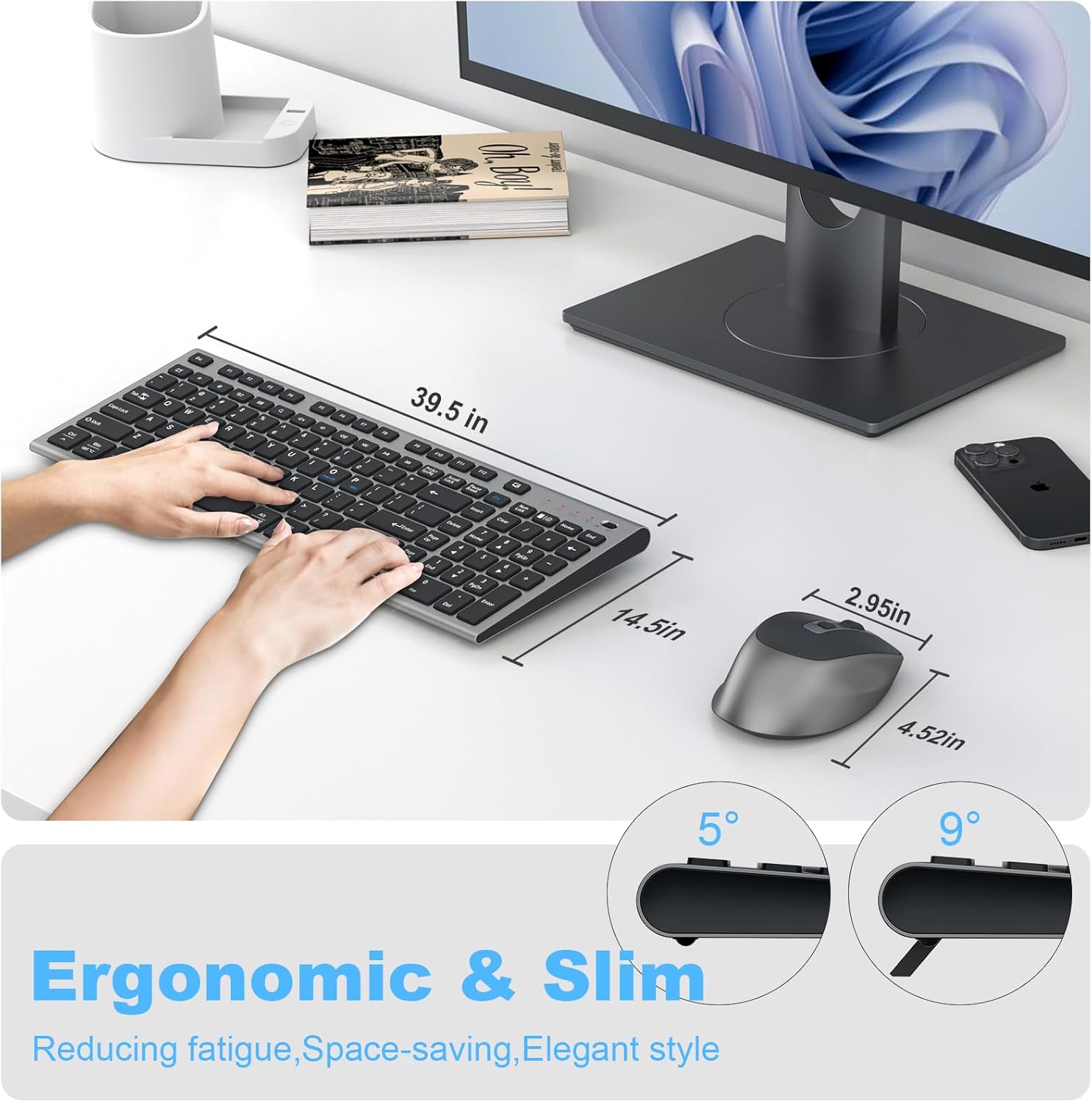 - ăErgonomics Designă: The key board tilt is adjustable, Effectively reduces hand fatigue.50-60g X-shaped structure keys, Achieve ultra-short stroke fast click and smooth typing experience. The concave surface of the keys makes it more comfortable for your fingers. The surface power switch and numeric keypad make operation efficient and convenient.Independent multimedia shortcut keys, Fully release the F1-F12 keys. 121-key compact layout, with full-size keyboard functions, while saving 10% of space, Achieve shorter and more convenient use distance, freeing up more desktop space.The mouse is of moderate size.Its unique contour and curve design make it more comfortable for you to use.