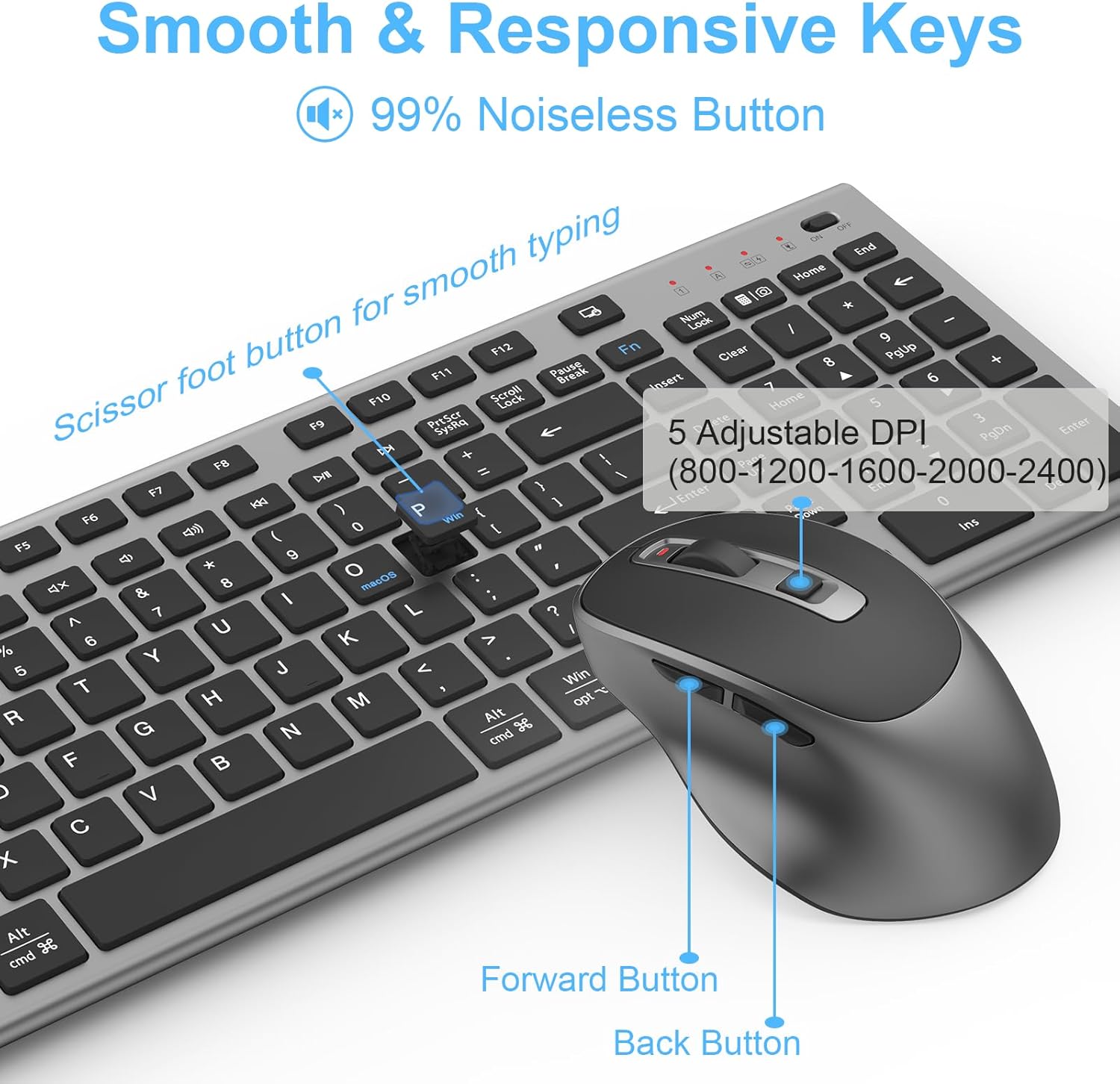 - ăLow Profile and Muteă: The keyboard adopts the X-frame design of the laptop keyboards. Bring an excellent low noise experience. The soft silicone shell not only protects the keyboard from water and dust, but also minimizes noise. The left and right buttons of the mice adopt excellent low decibel light click buttons. This design greatly reduces the noise of mouse use. Suitable for office, home, coffee shop, meeting room, school, and other occasions.