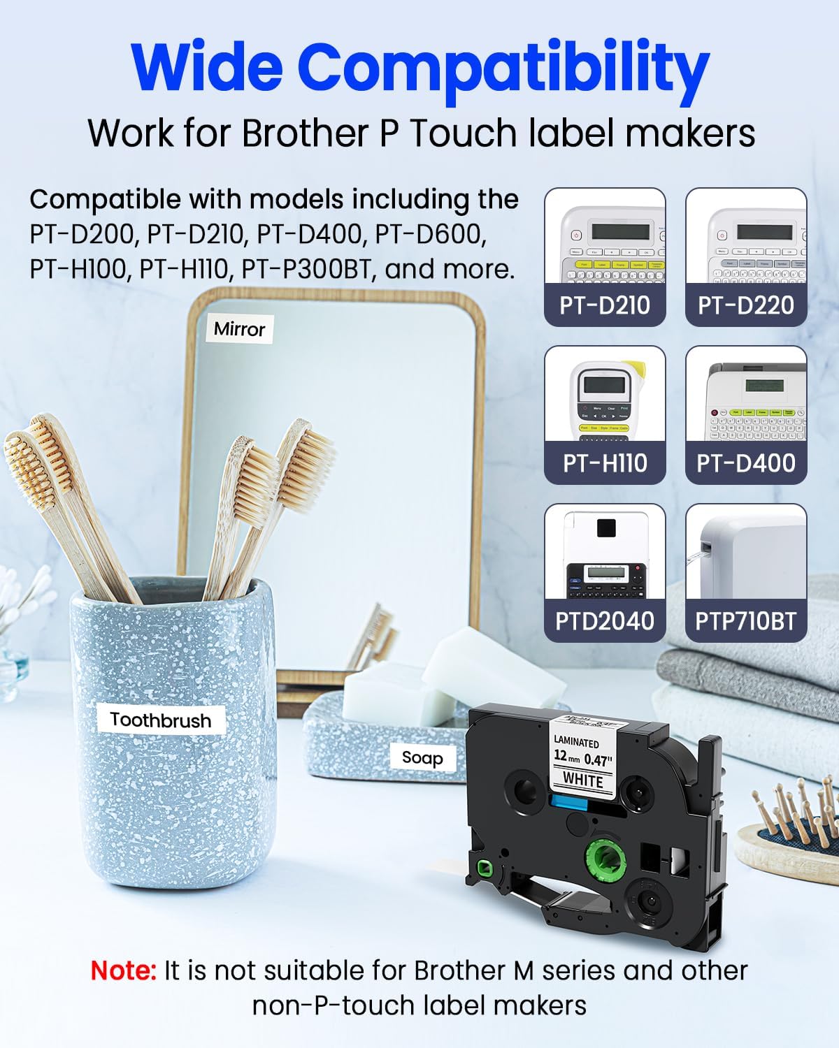 - TZe-231 compatible with Brother P-touch Label Maker: PT-D220, PT-D210, PT-H110, PT-D400, PT-D200, PT-D600, PT-H100, PT-P300BT, PT-P700, PT-P710BT, PT-D410, PT-D460BT, PT-D610BT, PT-H111, PT-H300, PT-H500LI, PT-D450, PT-D800W, PT-1190, PT-1230PC, PT-1880, PT-1890, PT-2430PC, PT-6100, PT-9600 and more. (Note: It is NOT suitable for Brother M series, Btag series tapes and TC tape.)